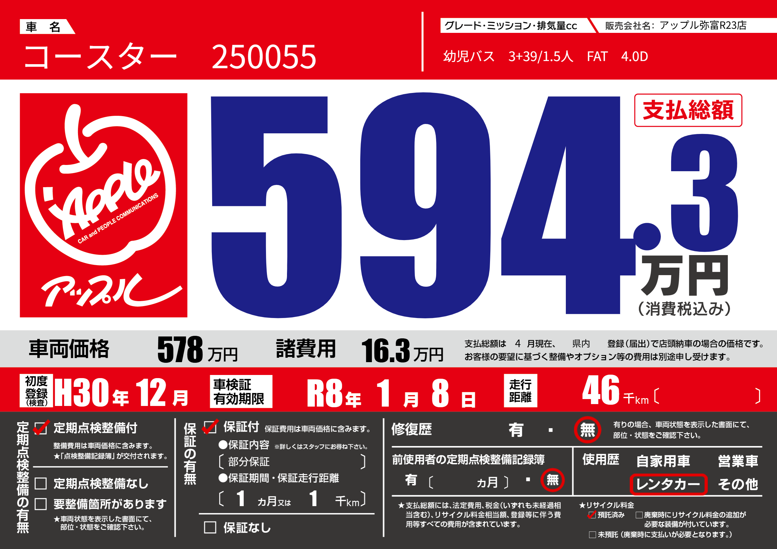 | 車名 | コースター 250055 | グレード ミッション 排気量 |