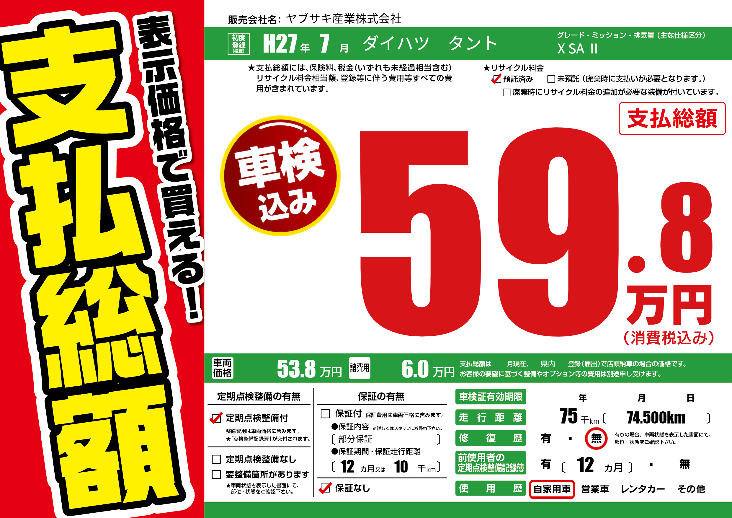 | 車名 | ダイハツ タント | グレード ミッション 排気量 |