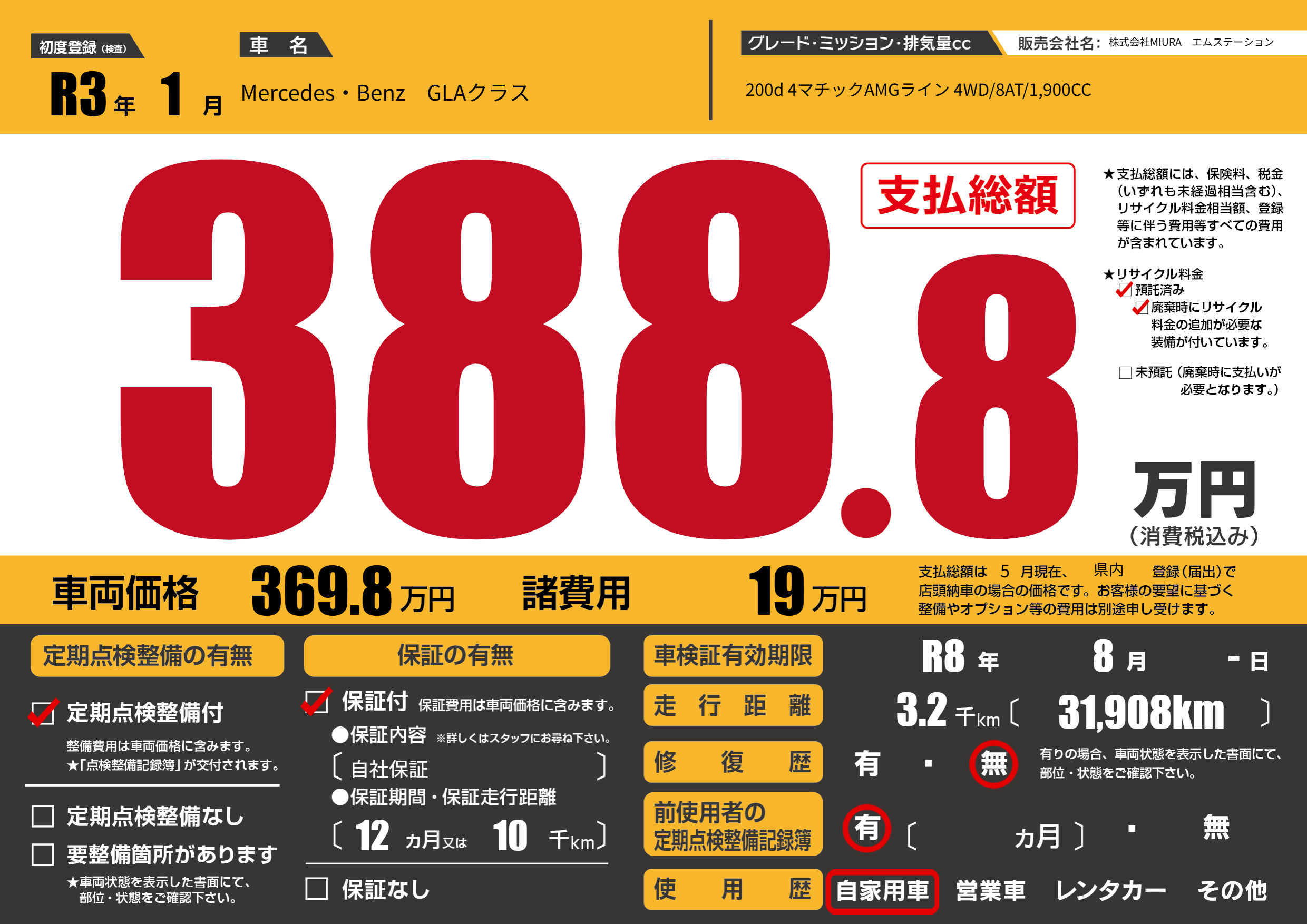 | 車名 | Mercedes・Benz GLAクラス | グレード ミッション 排気量 |