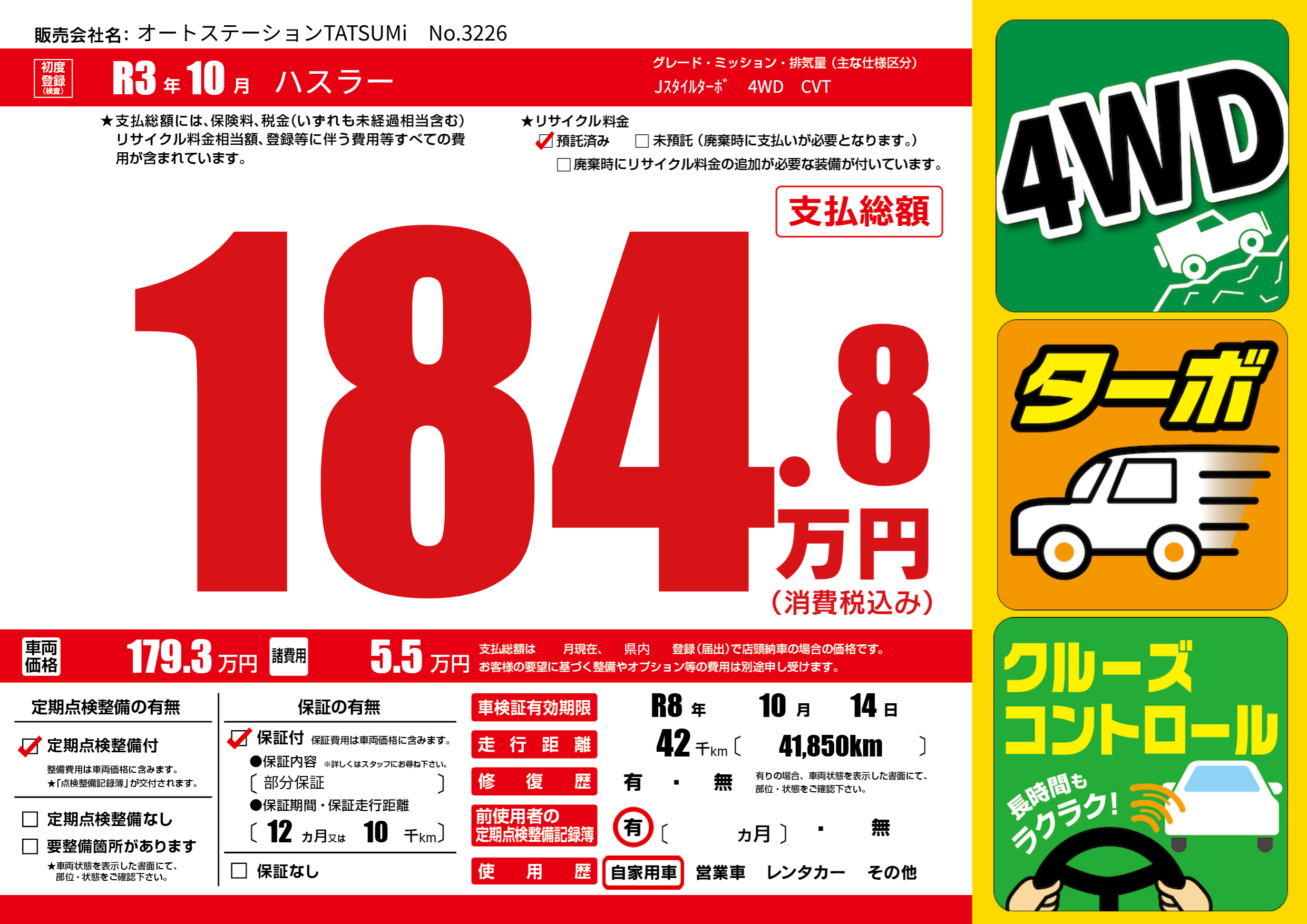 | 走行キロ | 4.2万km | 初年度登録 | R3年10月 |