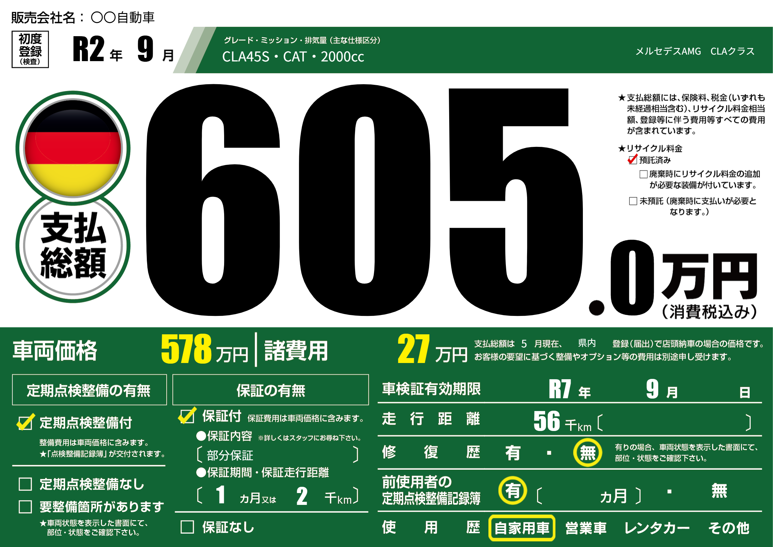 | 車名 | メルセデスAMG CLAクラス | グレード ミッション 排気量 |