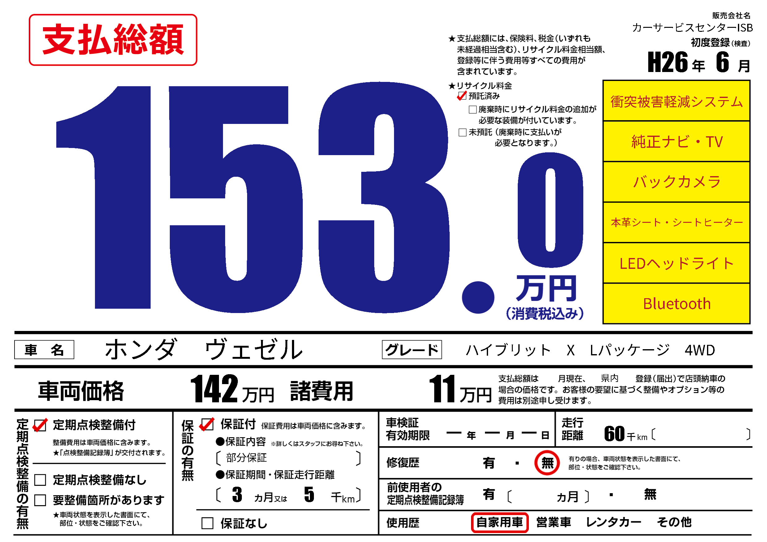 | 走行キロ | 6万km | 初年度登録 | H26年6月 |