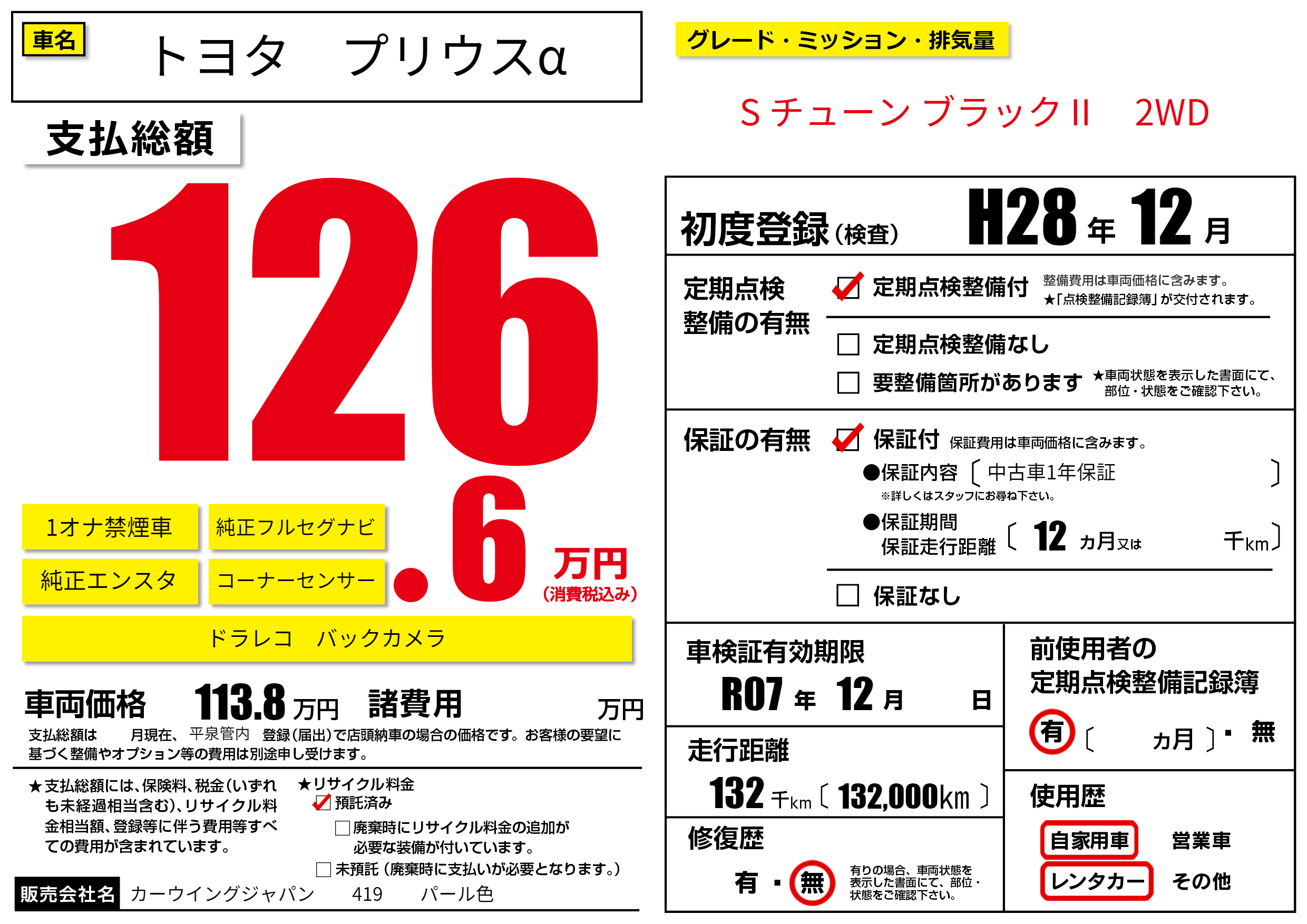| 走行キロ | 13.2万km | 初年度登録 | H28年12月 |