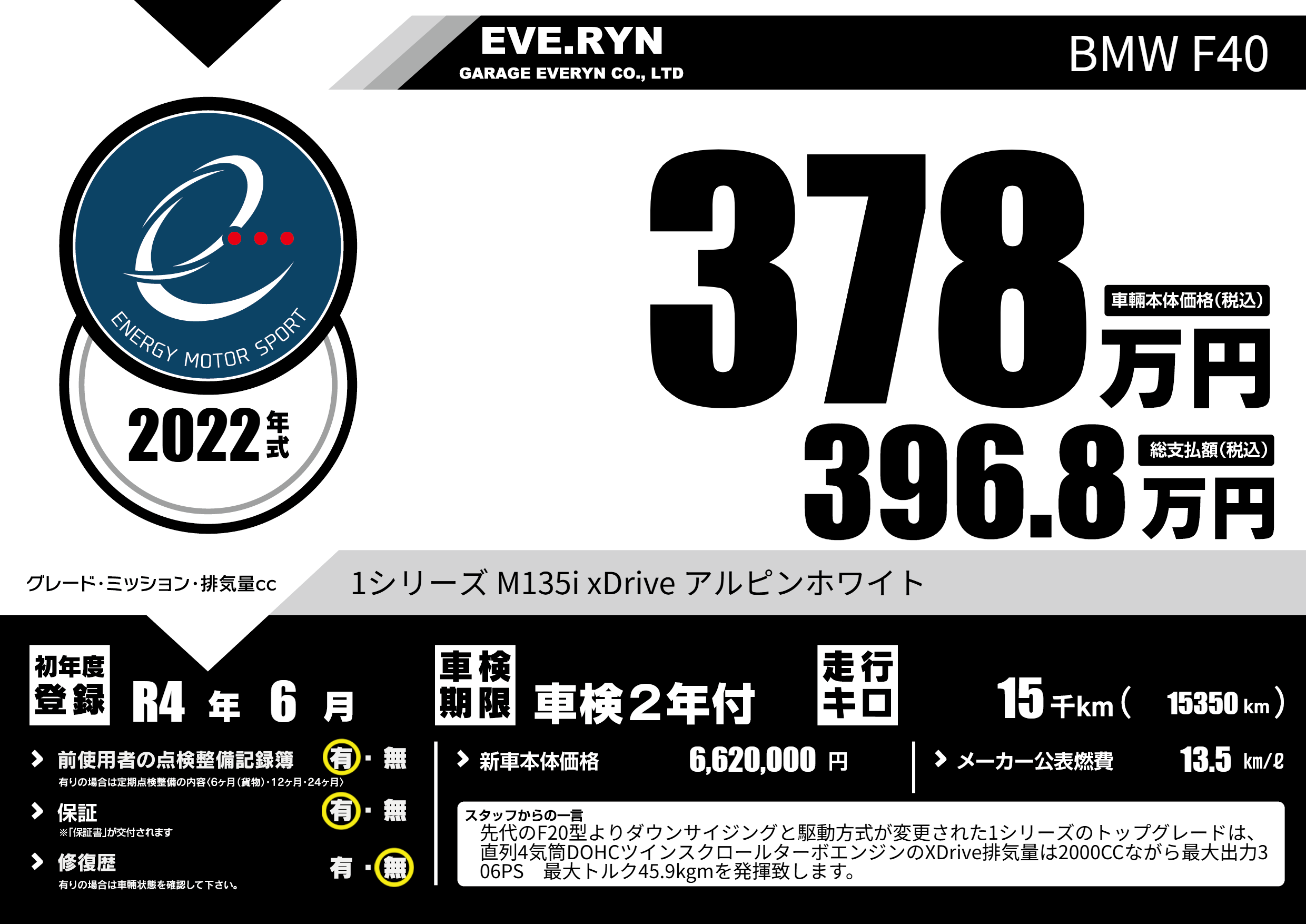 | 車名 | BMW F40 | グレード ミッション 排気量 |