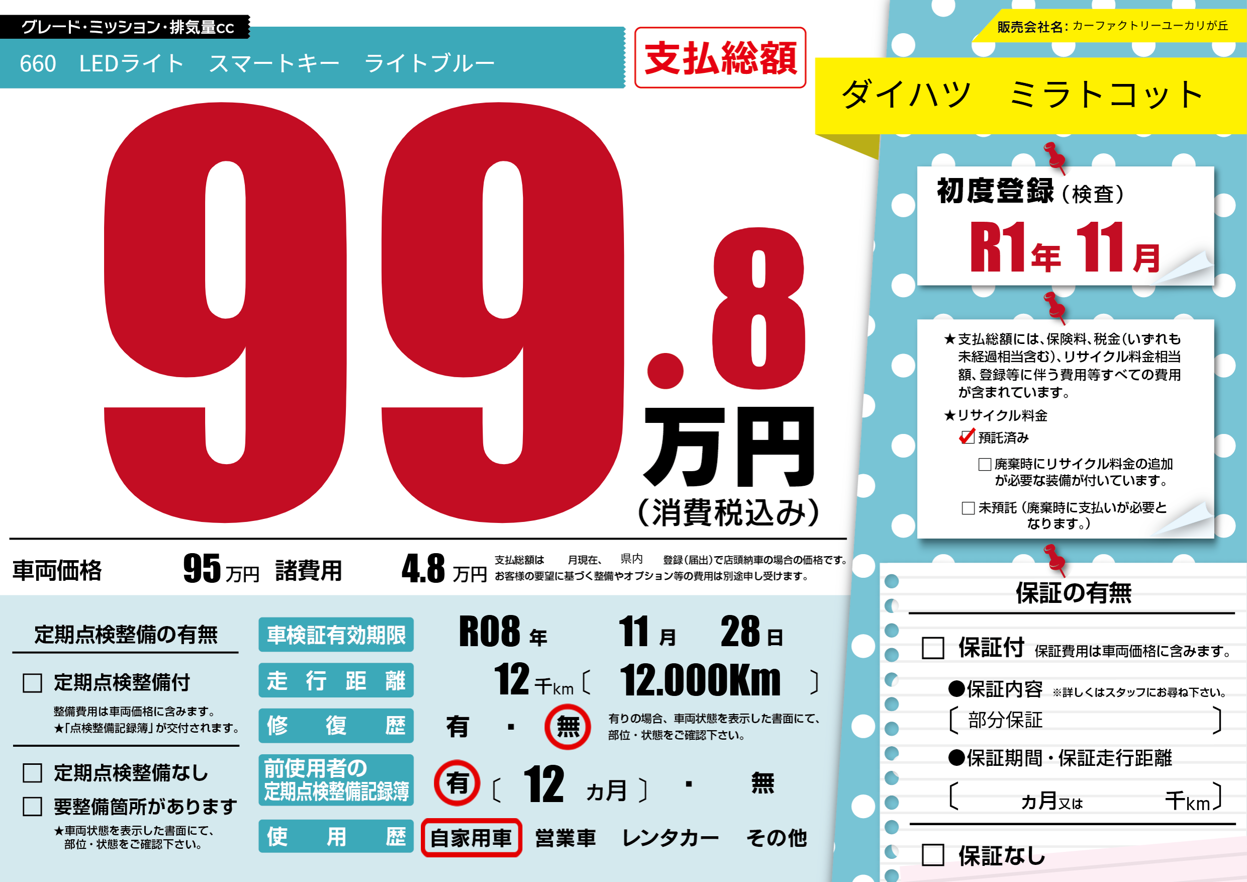 保証なし 保証内容(部分保証) ---ヶ月または()千kmまで |