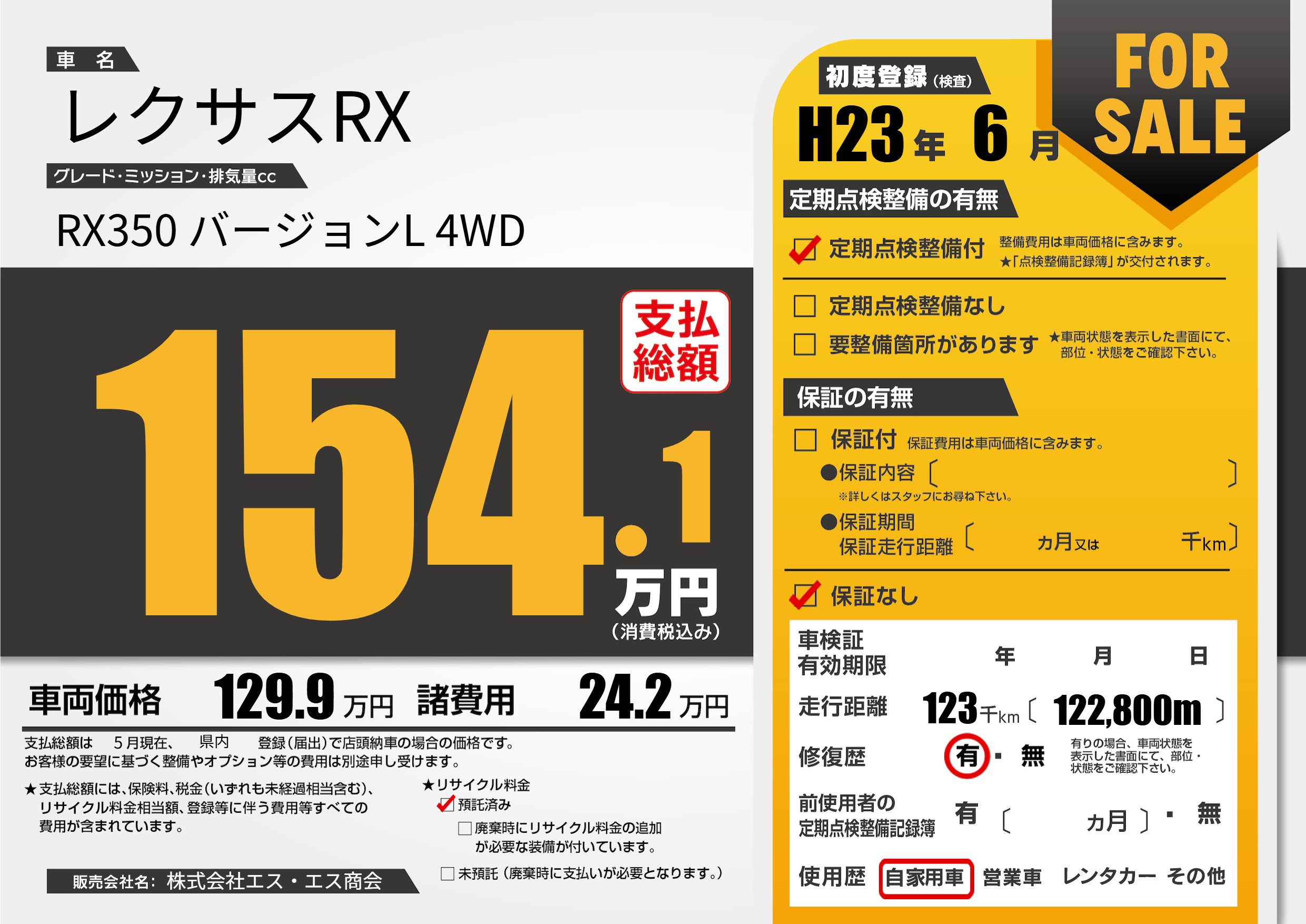 | 車名 | レクサスRX | グレード ミッション 排気量 |