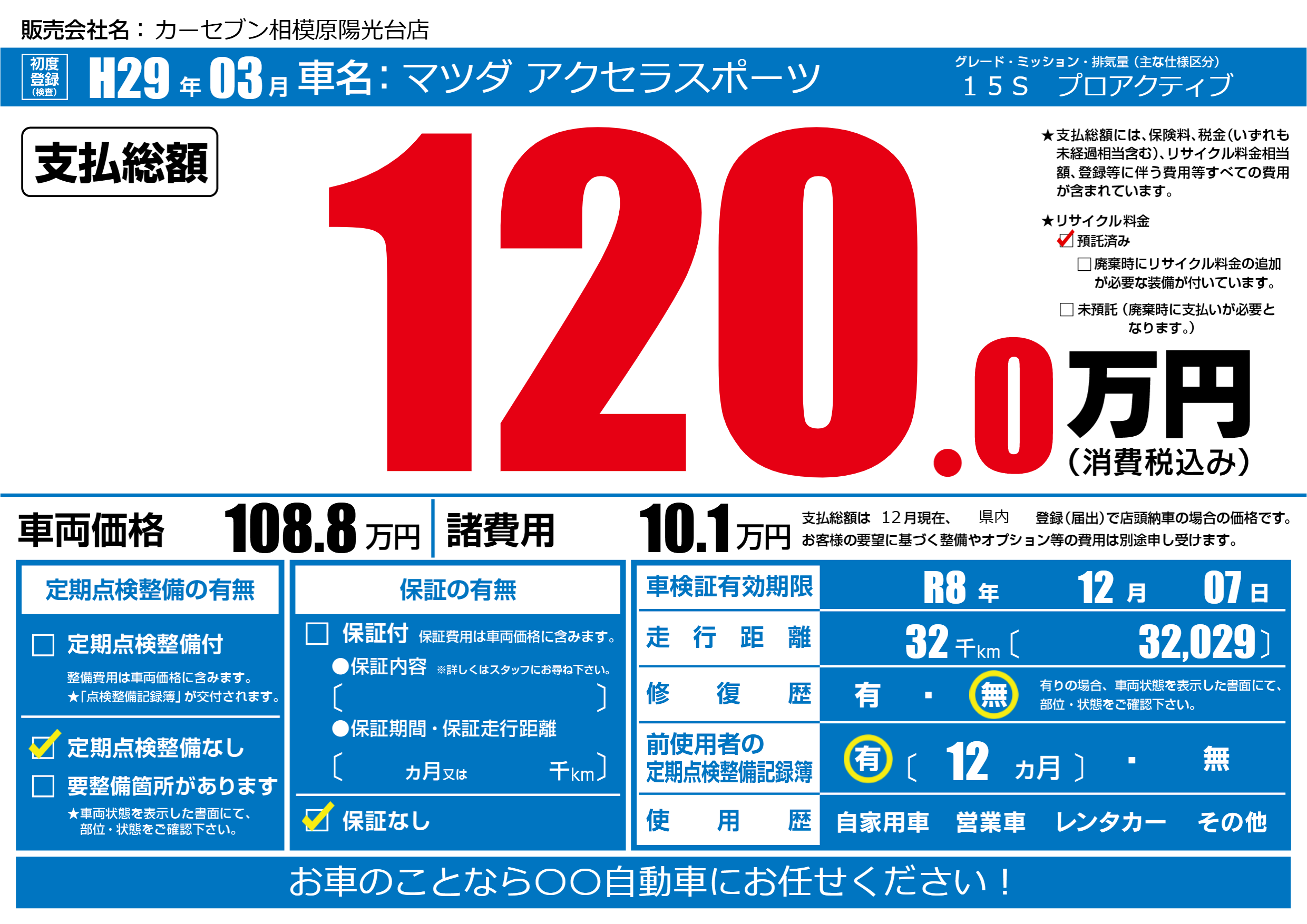 | 車名 | マツダ アクセラスポーツ | グレード ミッション 排気量 |
