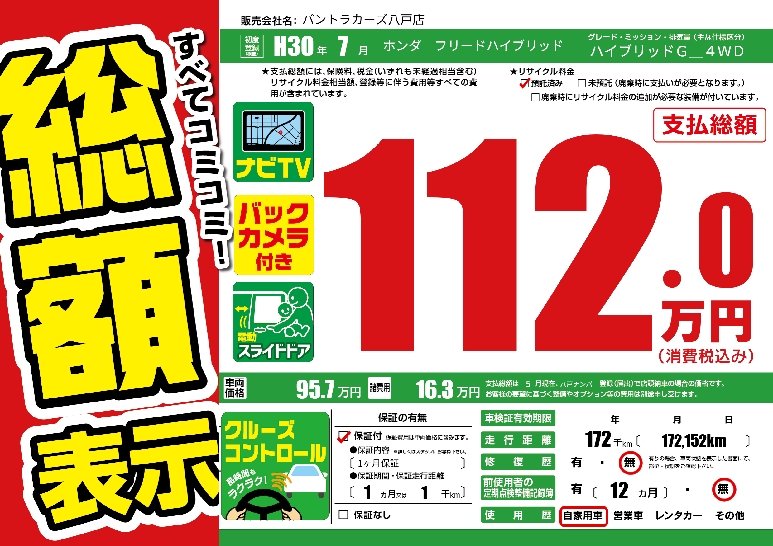 | 走行キロ | 17.2万km | 初年度登録 | H30年7月 |