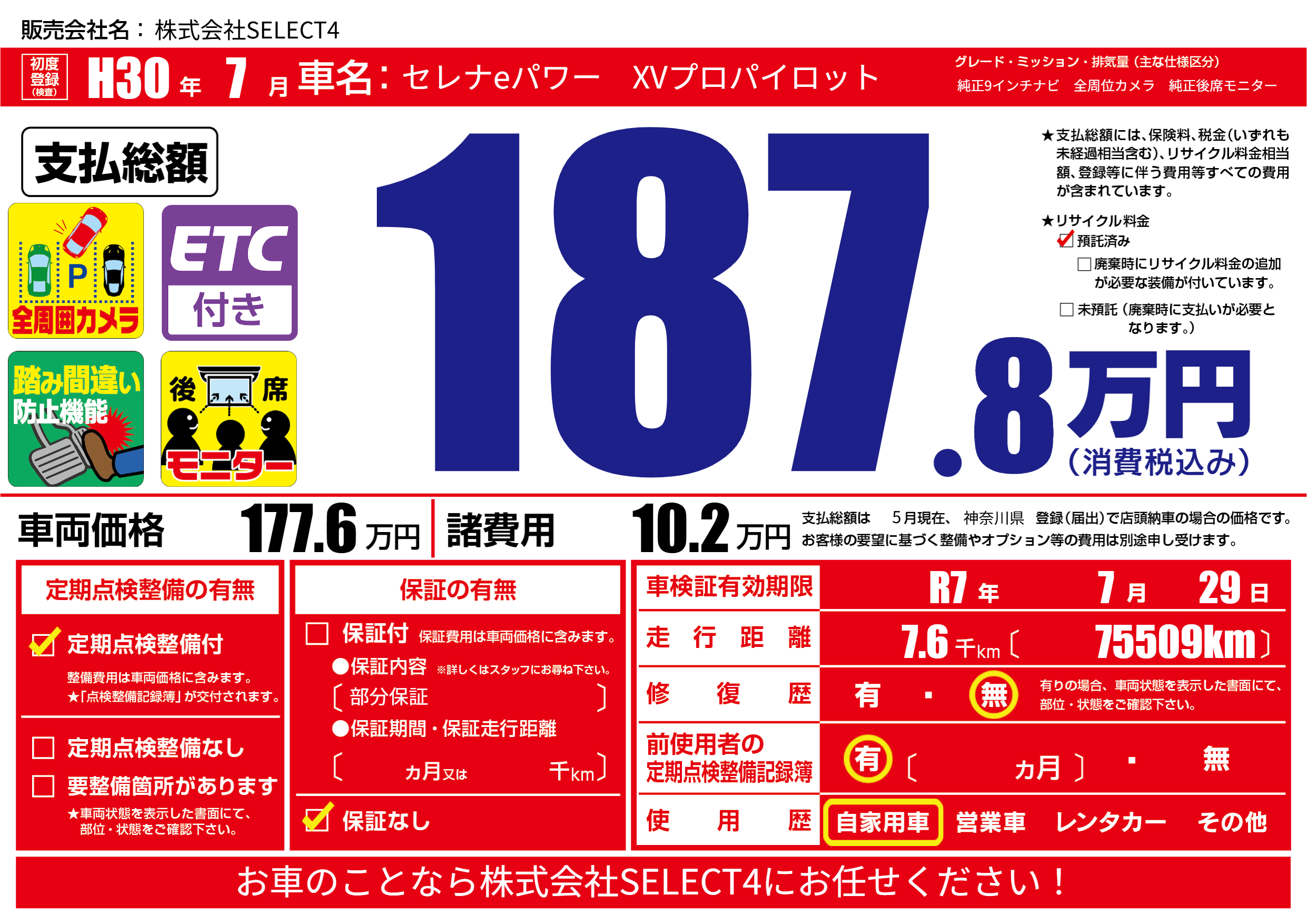 | 車名 | セレナeパワー XVプロパイロット | グレード ミッション 排気量 |