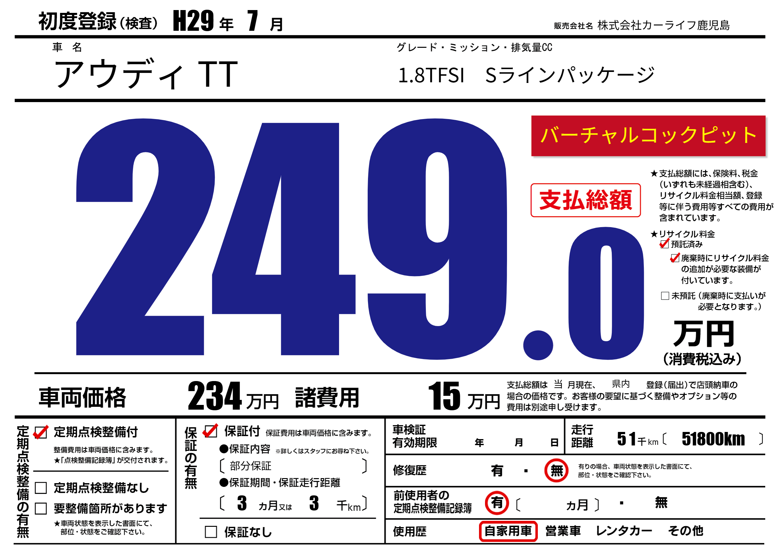 | 車名 | アウディ TT | グレード ミッション 排気量 |