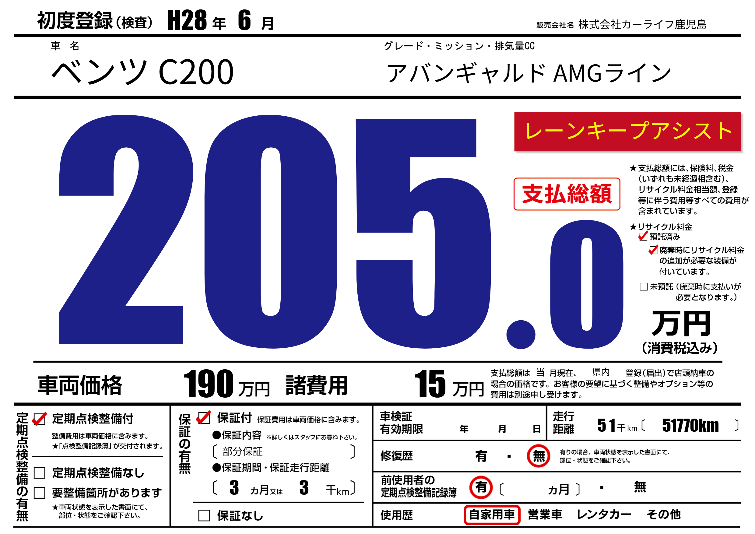 | 車名 | ベンツ C200 | グレード ミッション 排気量 |