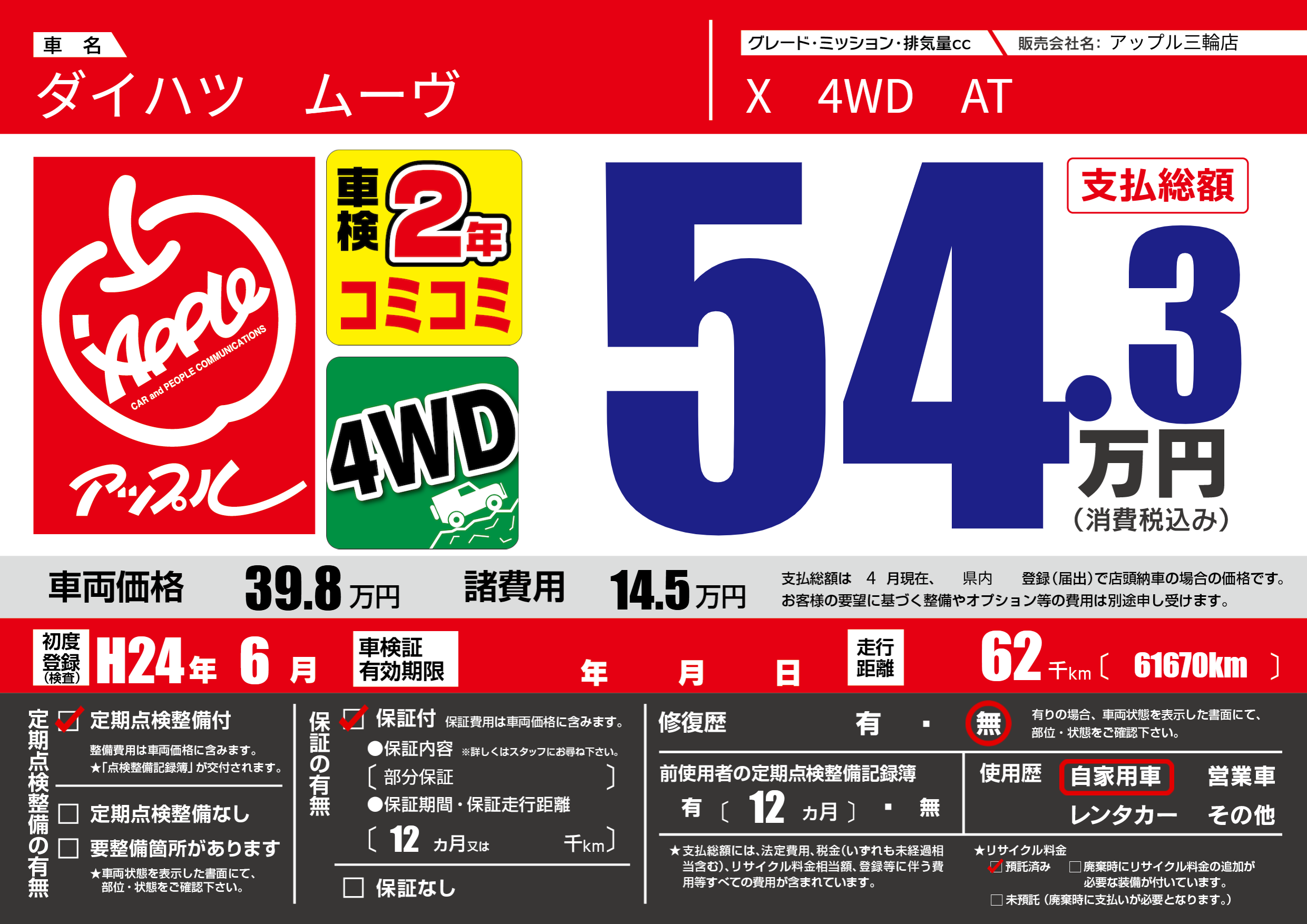 | 車名 | ダイハツ ムーヴ | グレード ミッション 排気量 |