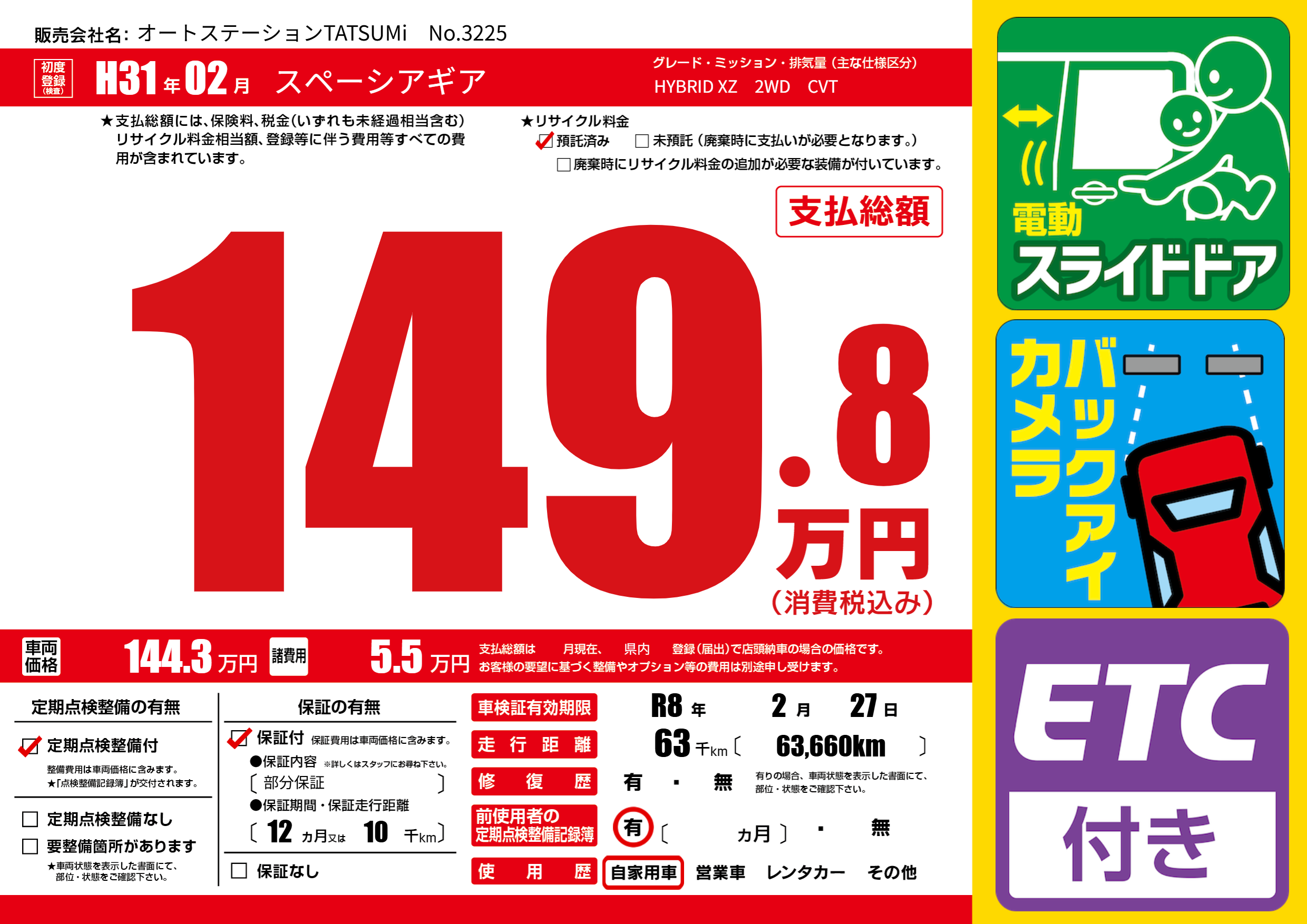 | 走行キロ | 6.3万km | 初年度登録 | H31年02月 |