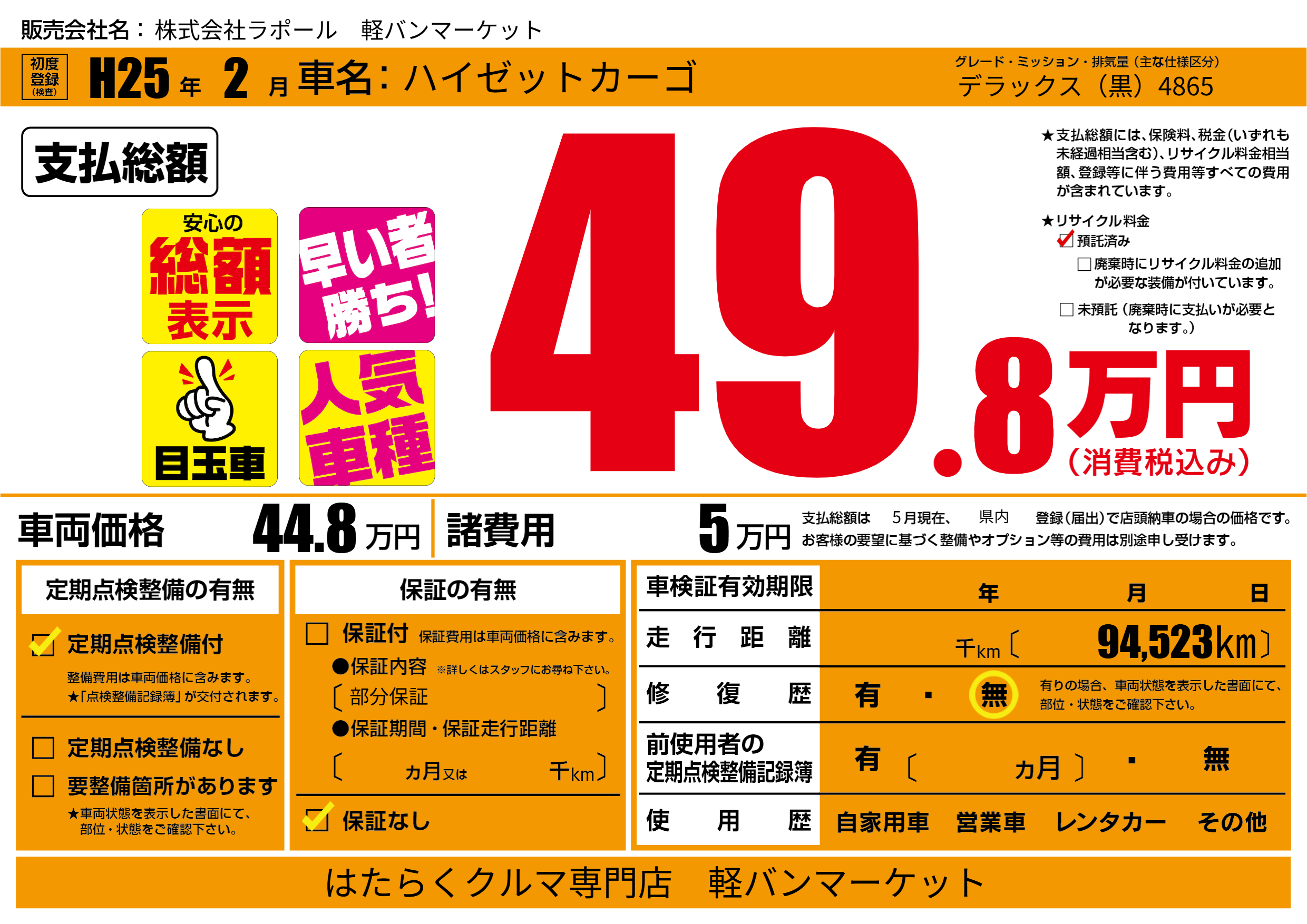 | 車名 | ハイゼットカーゴ | グレード ミッション 排気量 |