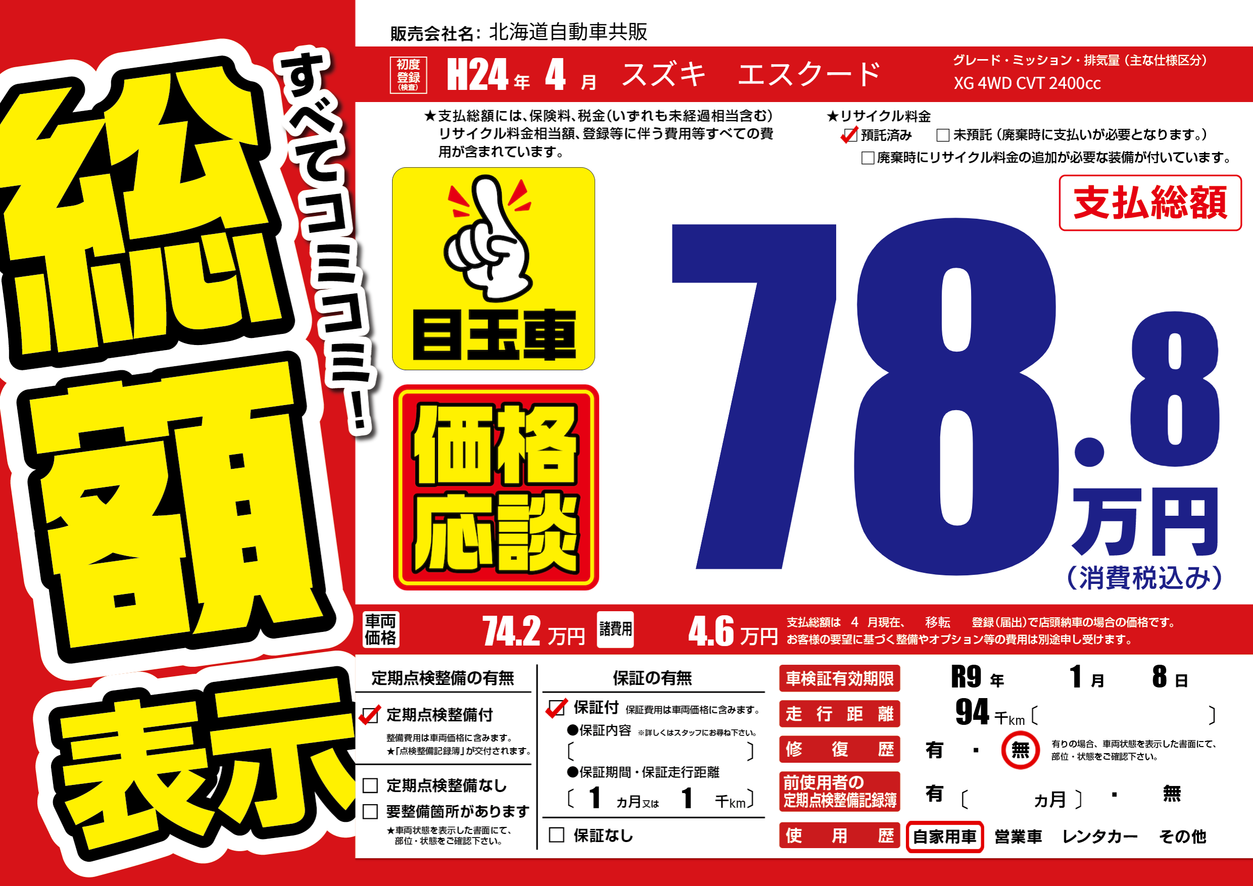 | 走行キロ | 9.4万km | 初年度登録 | H24年4月 |