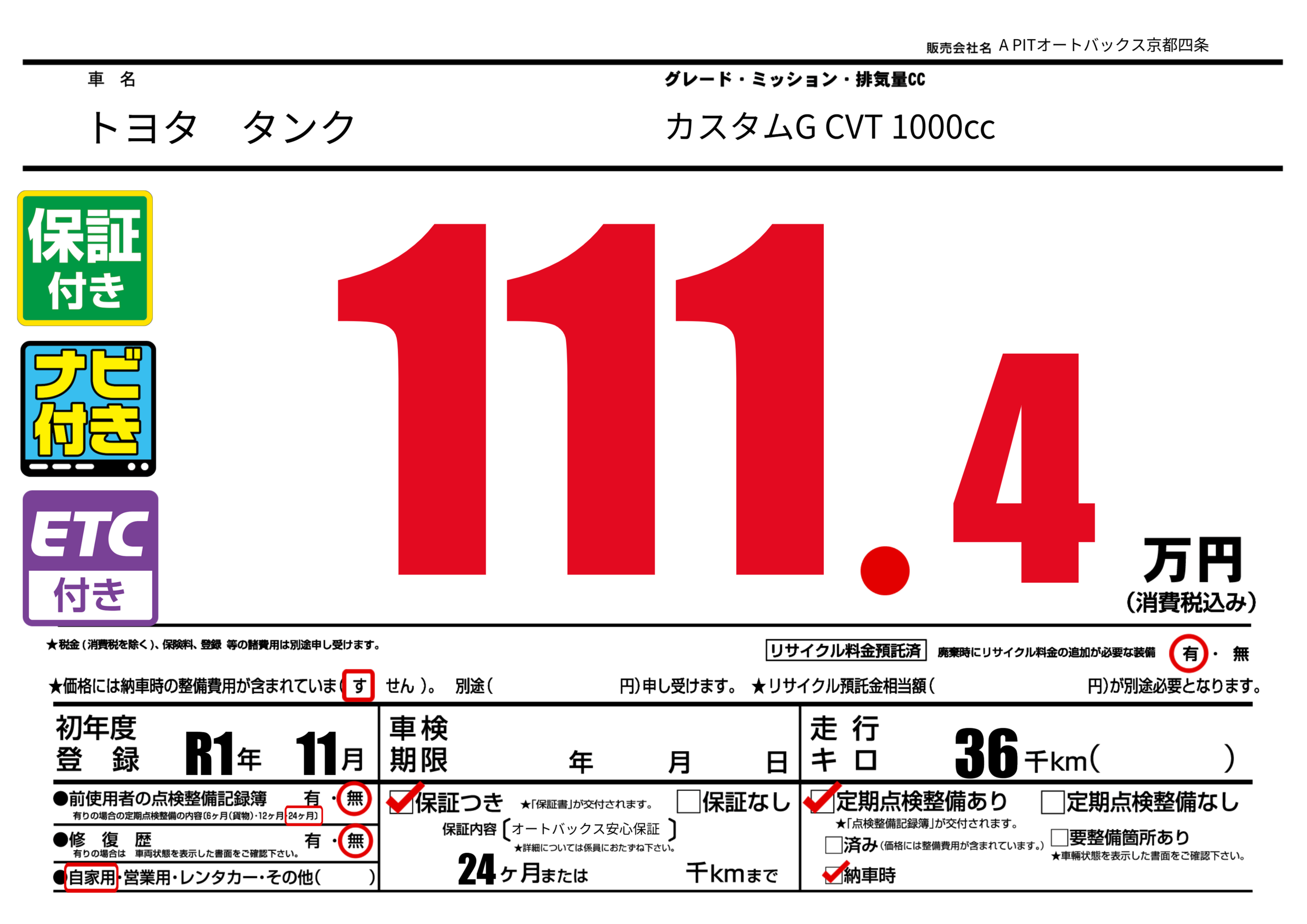 | 車名 | トヨタ タンク | グレード ミッション 排気量 |