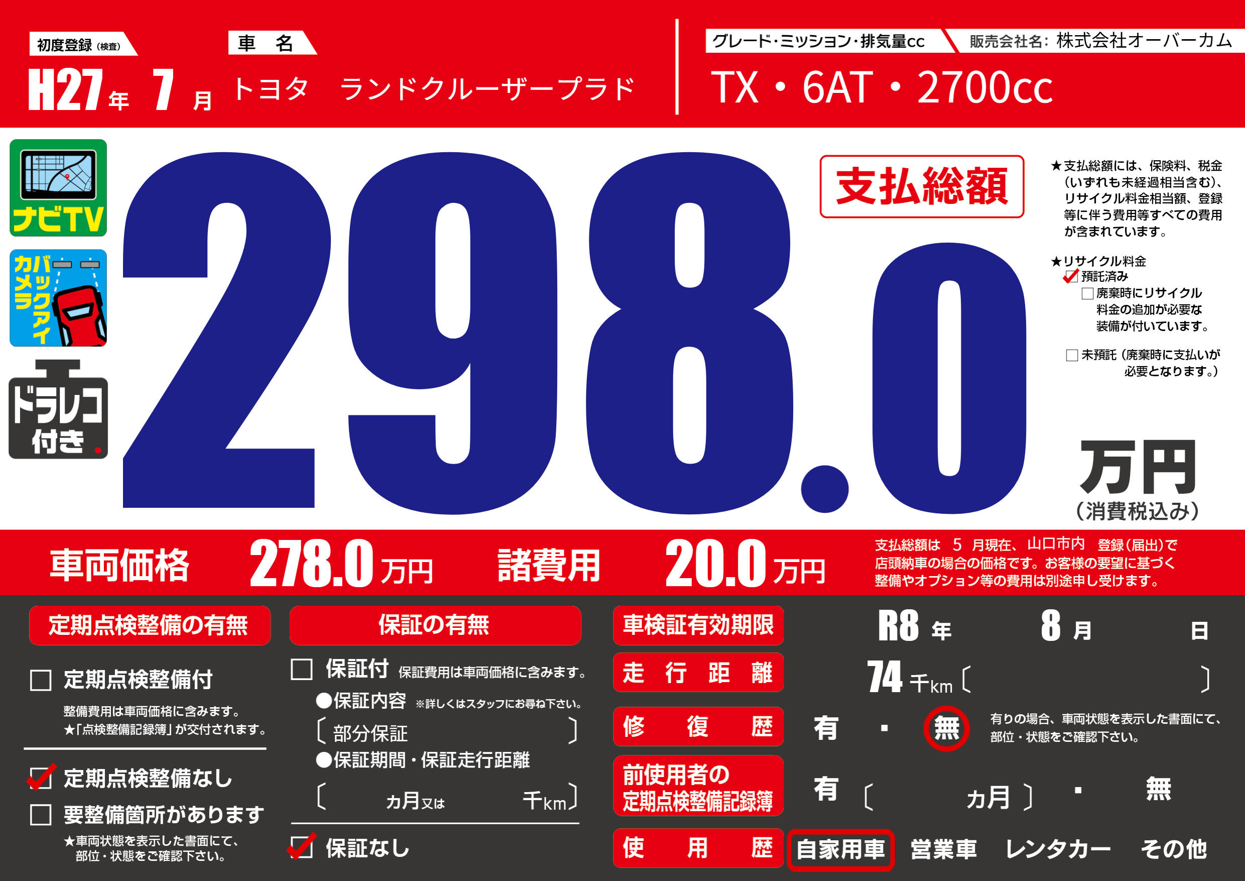 | 車検制限 | R8年 8月 - 日 | ||