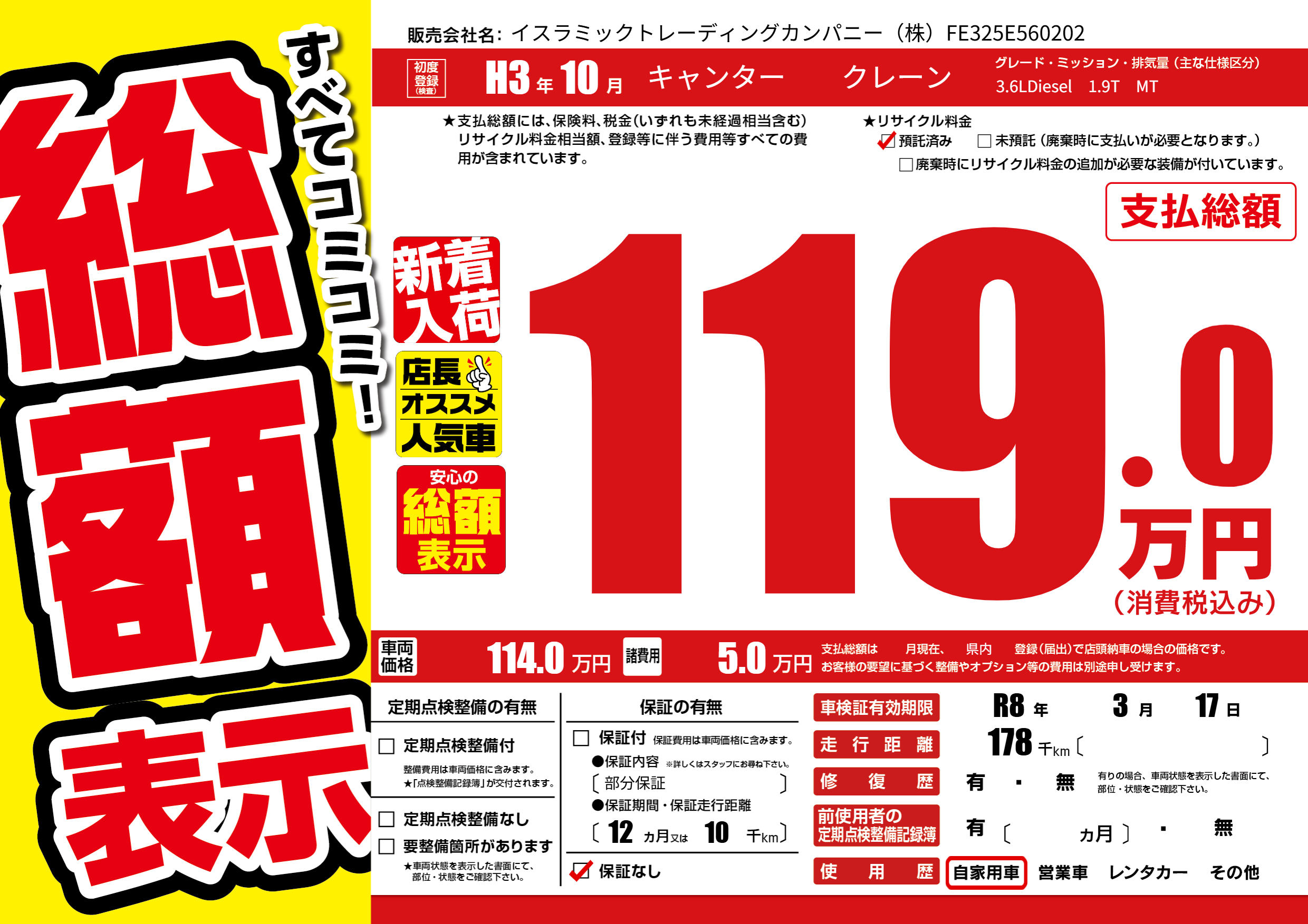 | 走行キロ | 17.8万km | 初年度登録 | H3年10月 |