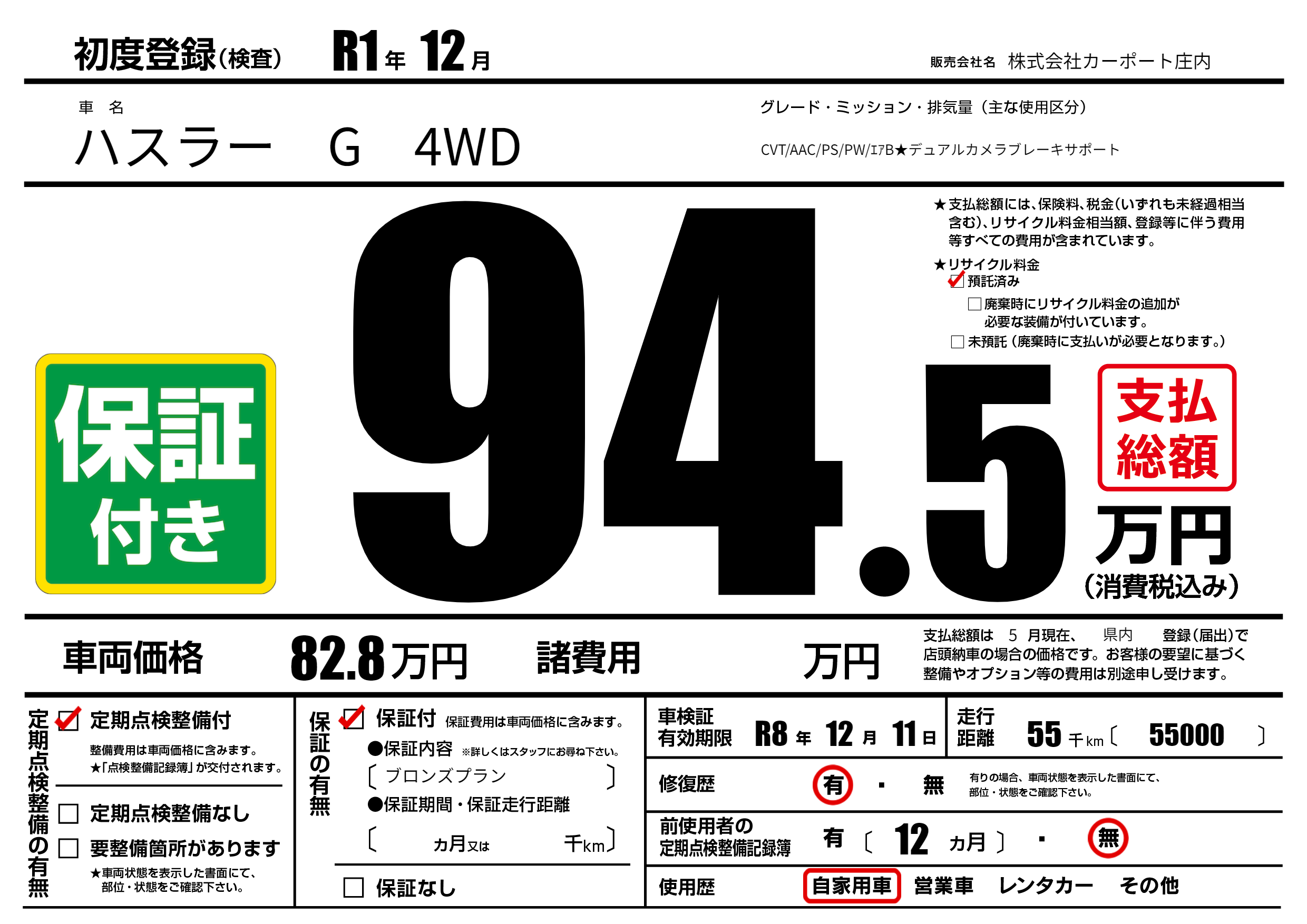| 車名 | ハスラー G 4WD | グレード ミッション 排気量 |