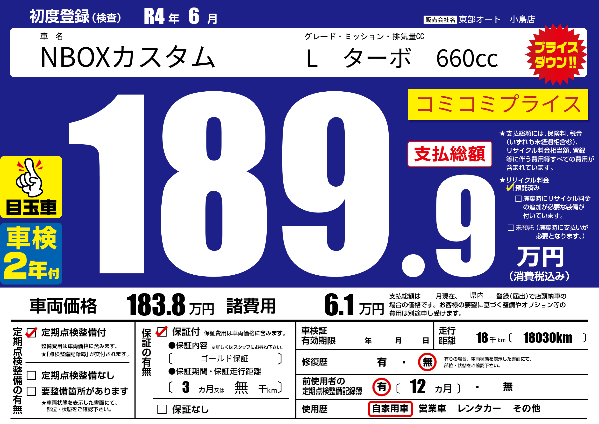 | 車名 | NBOXカスタム | グレード ミッション 排気量 |