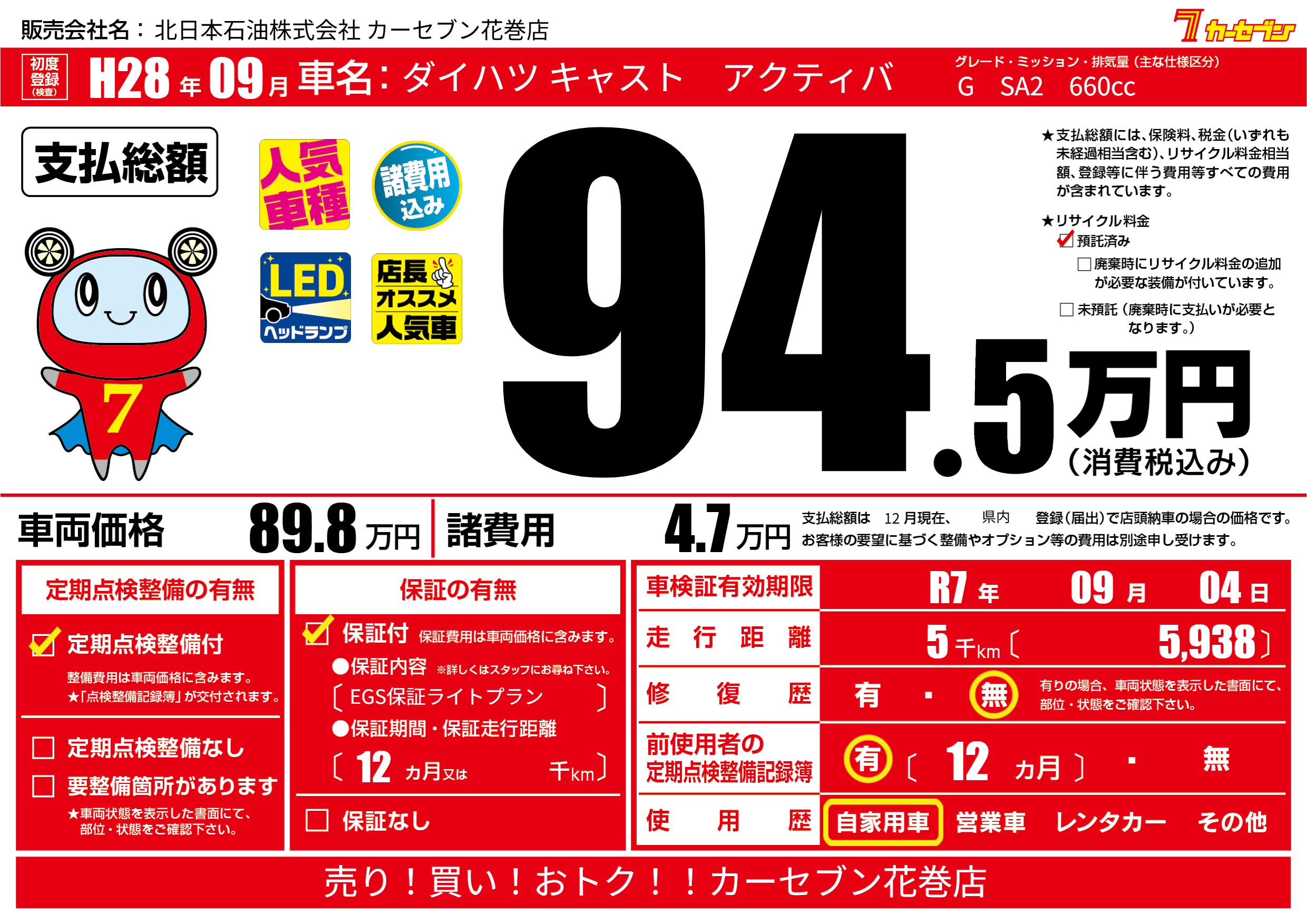 | 走行キロ | 0.5万km | 初年度登録 | H28年09月 |