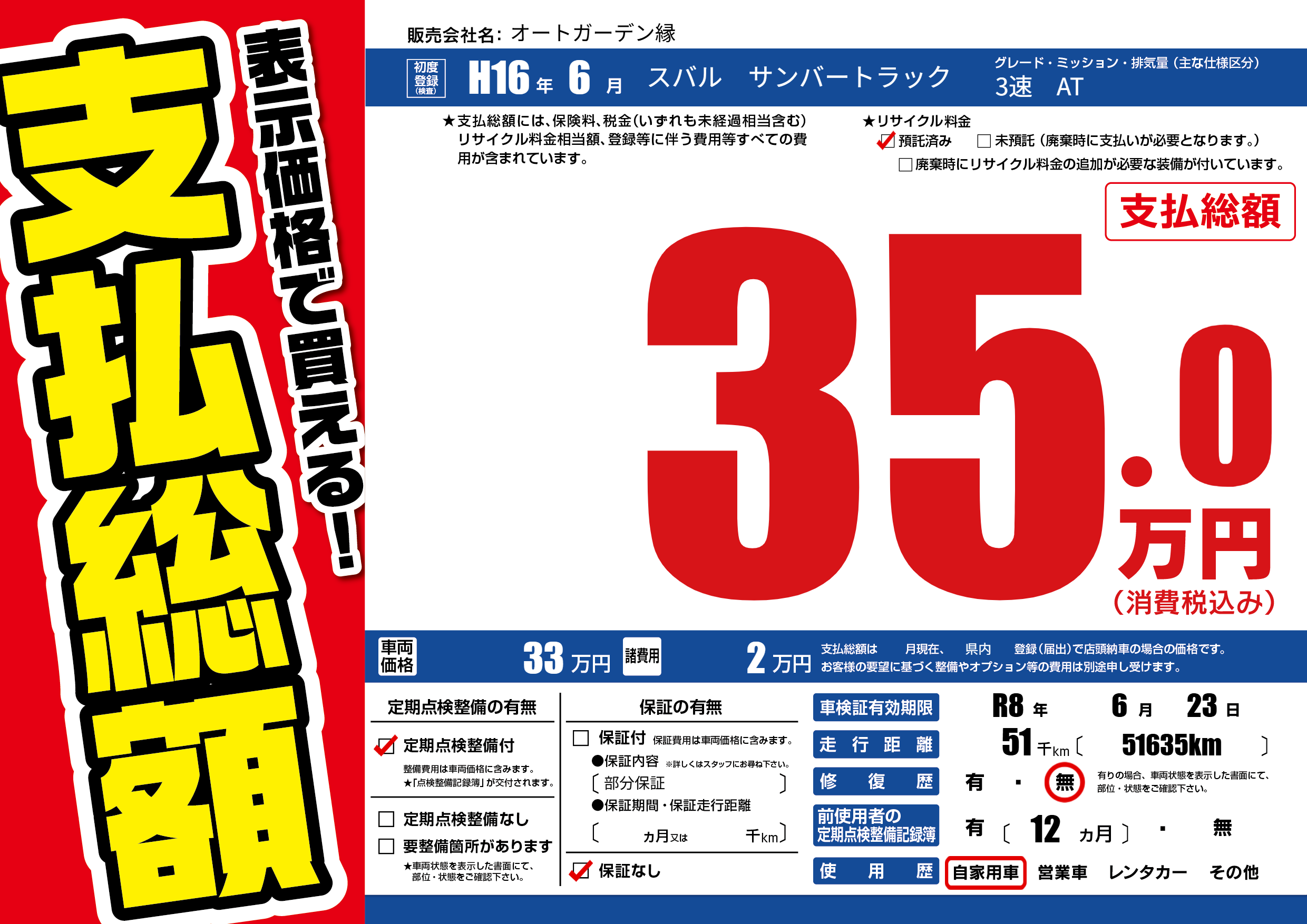 | 車名 | スバル サンバートラック | グレード ミッション 排気量 |