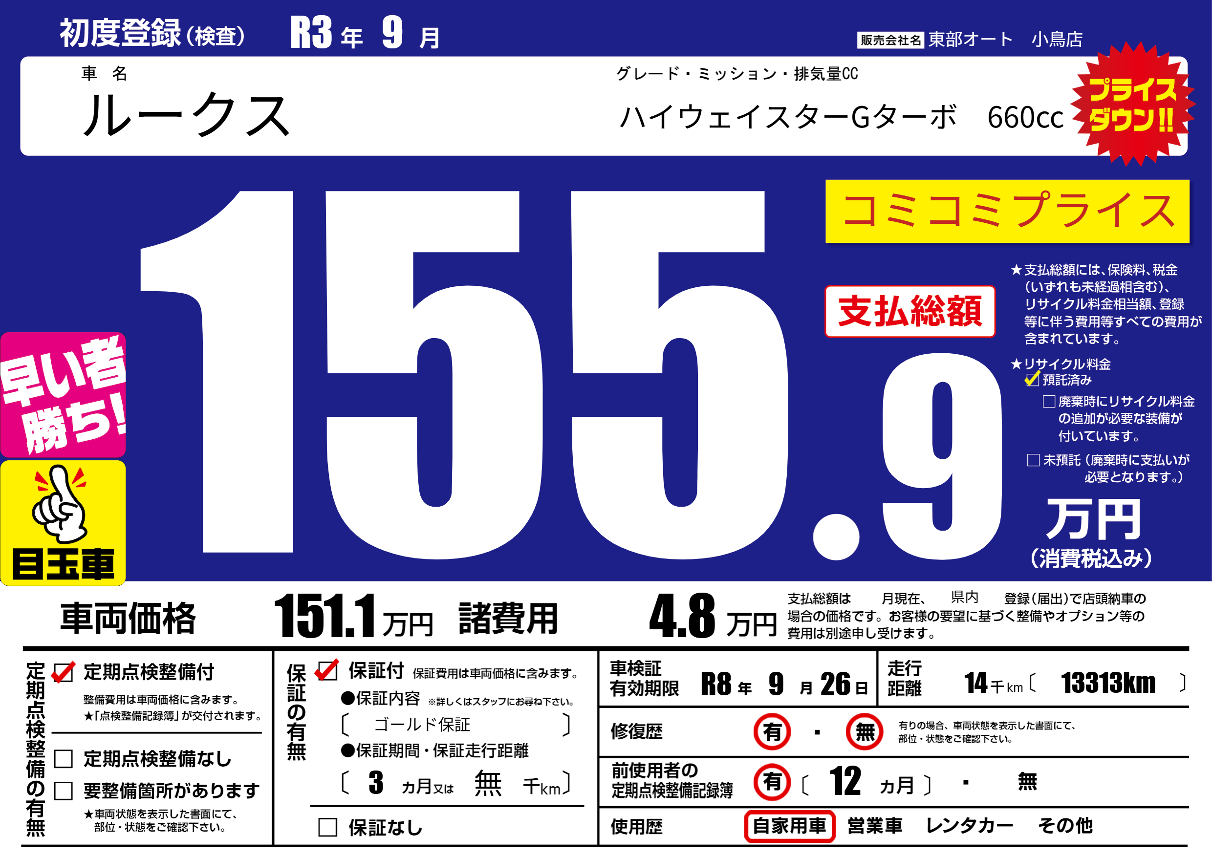 保証付き 保証内容( ゴールド保証) 3ヶ月または(無)千kmまで |