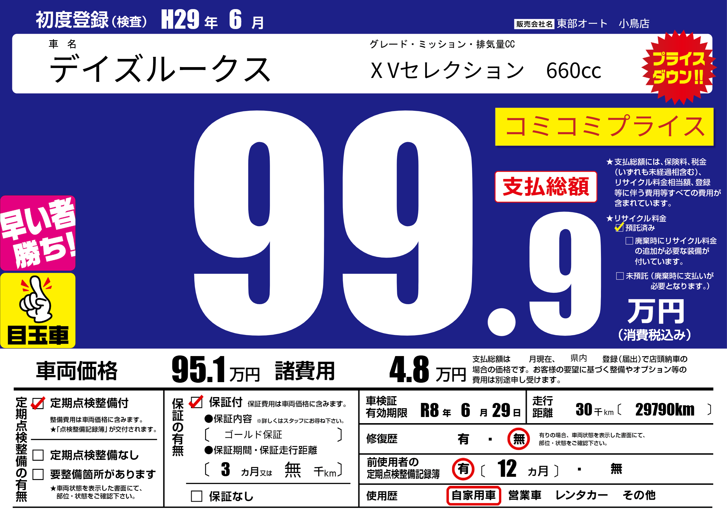 | 走行キロ | 3万km | 初年度登録 | H29年6月 |