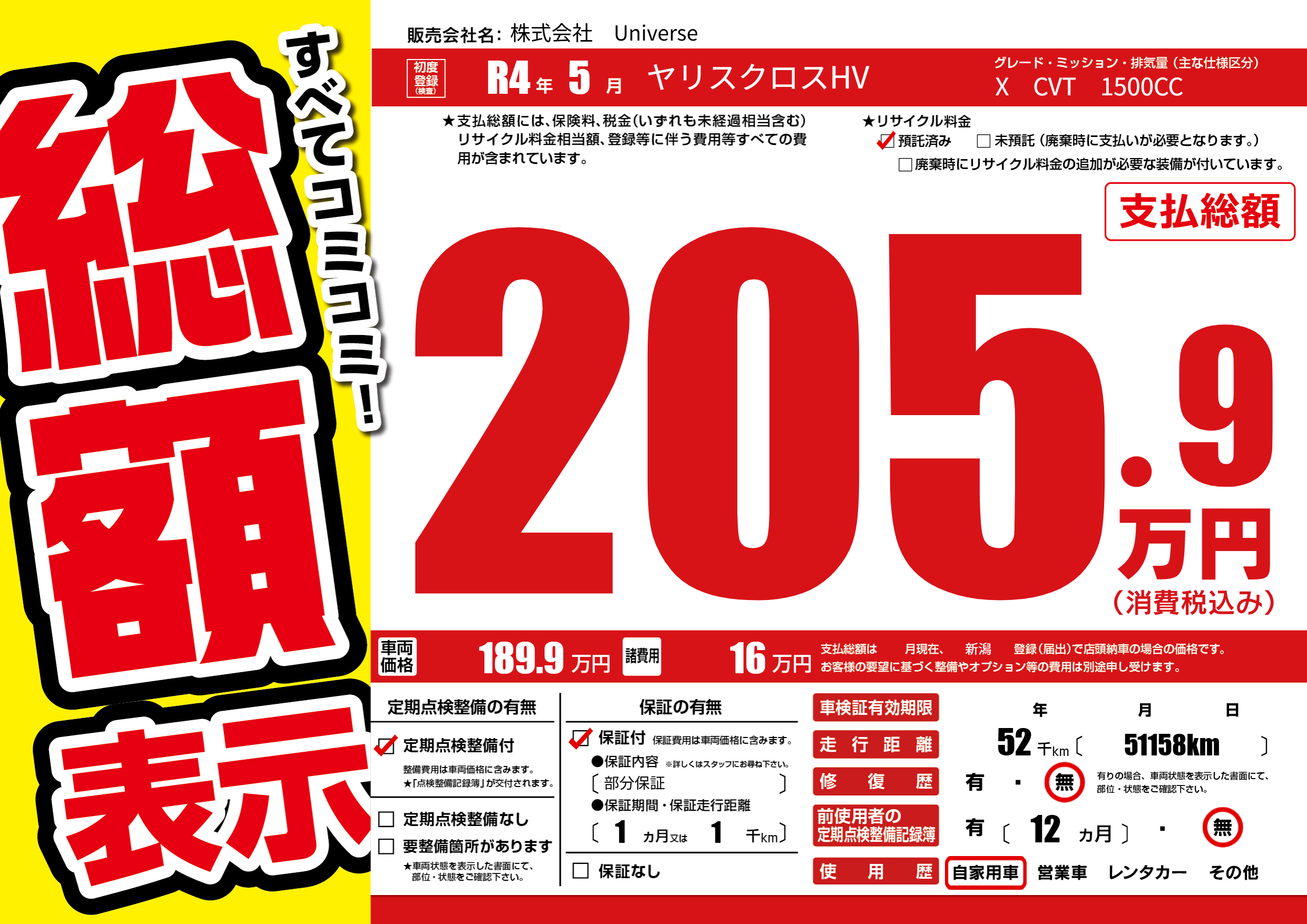 | 車名 | ヤリスクロスHV | グレード ミッション 排気量 |