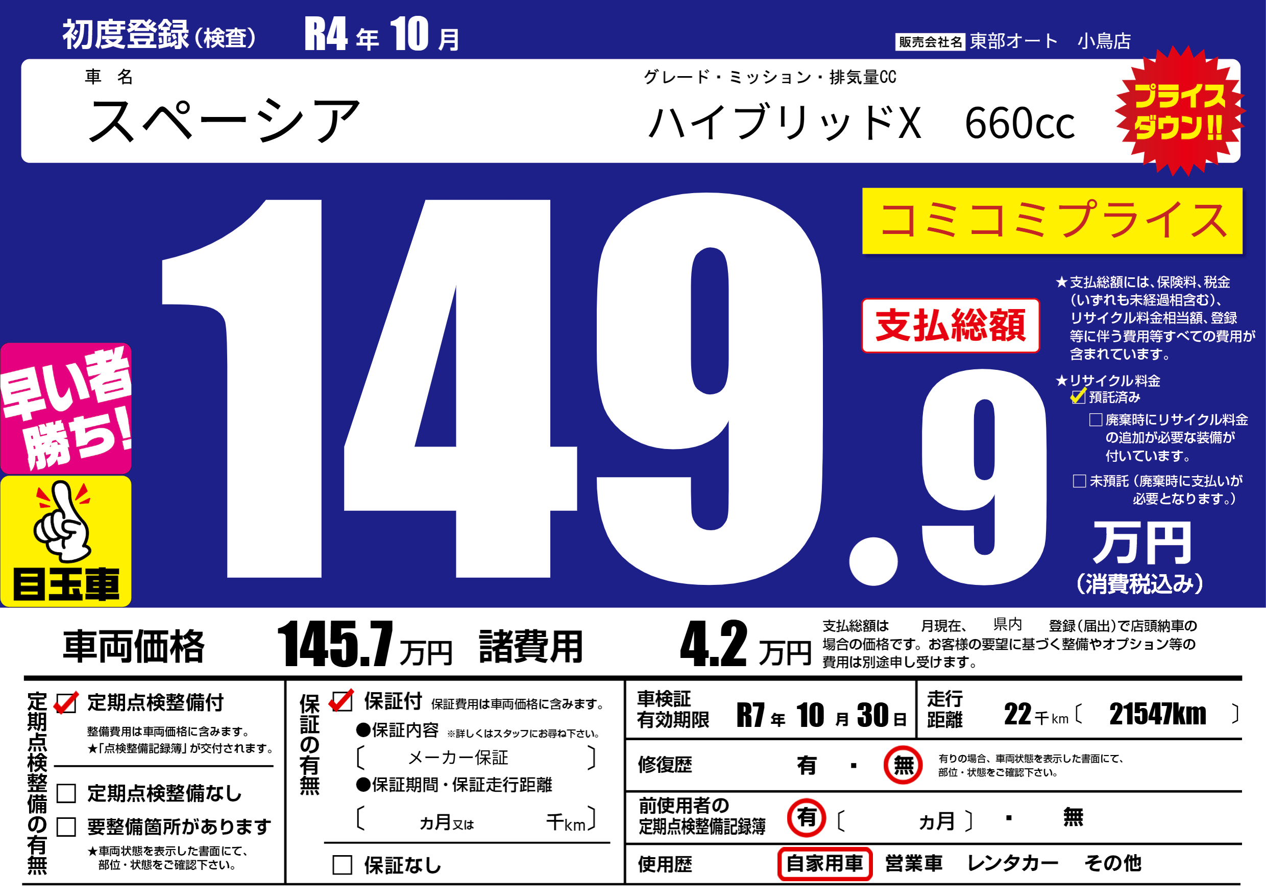 | 走行キロ | 2.2万km | 初年度登録 | R4年10月 |