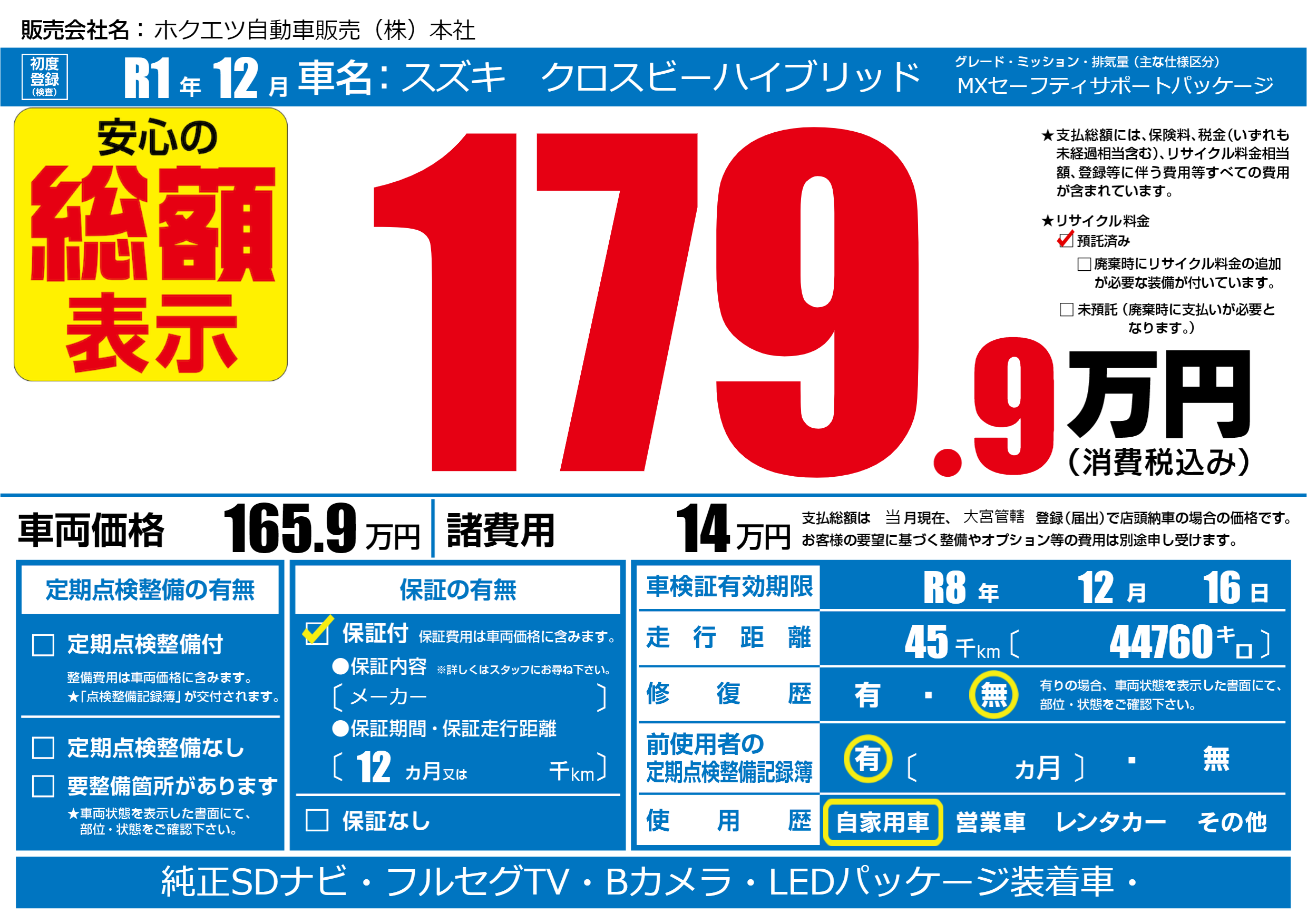 | 車名 | スズキ クロスビーハイブリッド | グレード ミッション 排気量 |