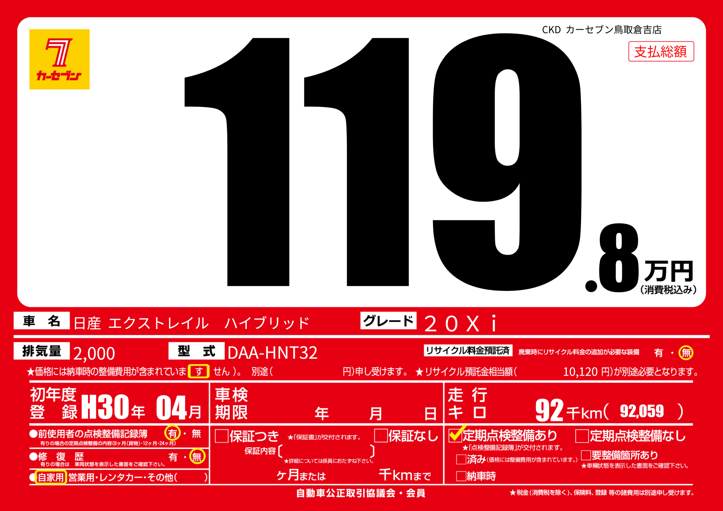 | 走行キロ | 9.2万km | 初年度登録 | H30年04月 |