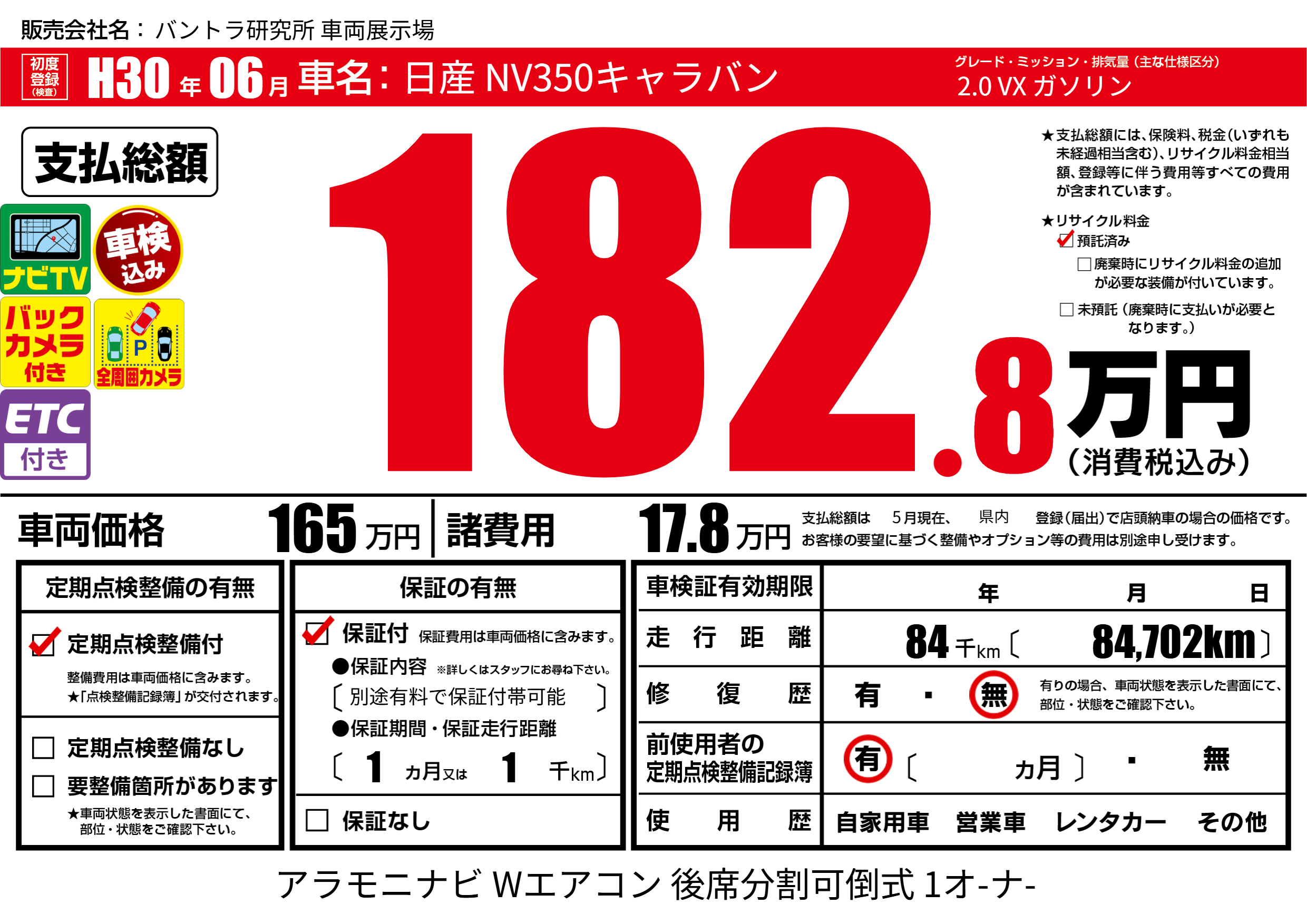 | 車名 | 日産 NV350キャラバン | グレード ミッション 排気量 |