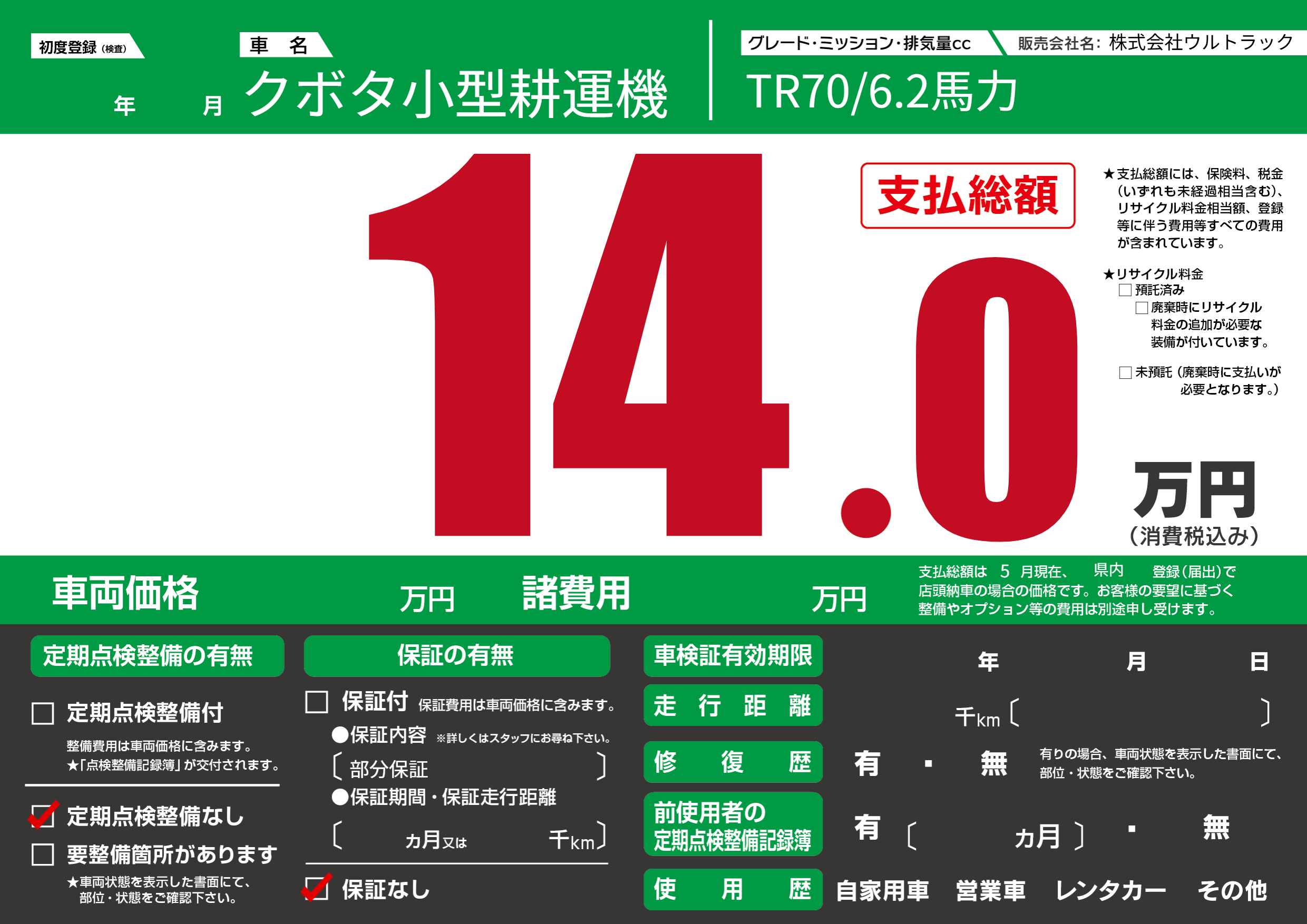 | 車名 | クボタ小型耕運機 | グレード ミッション 排気量 |