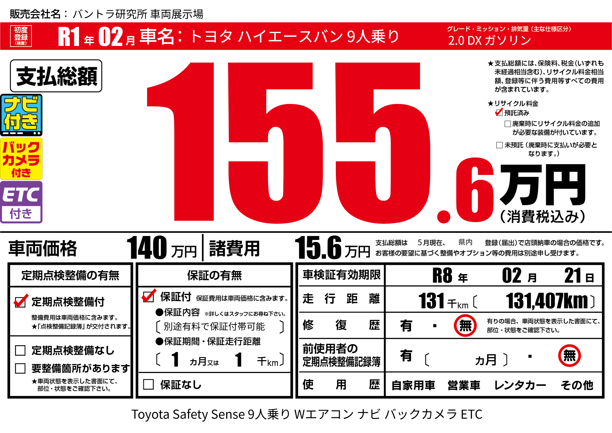 | 車名 | トヨタ ハイエースバン 9人乗り | グレード ミッション 排気量 |