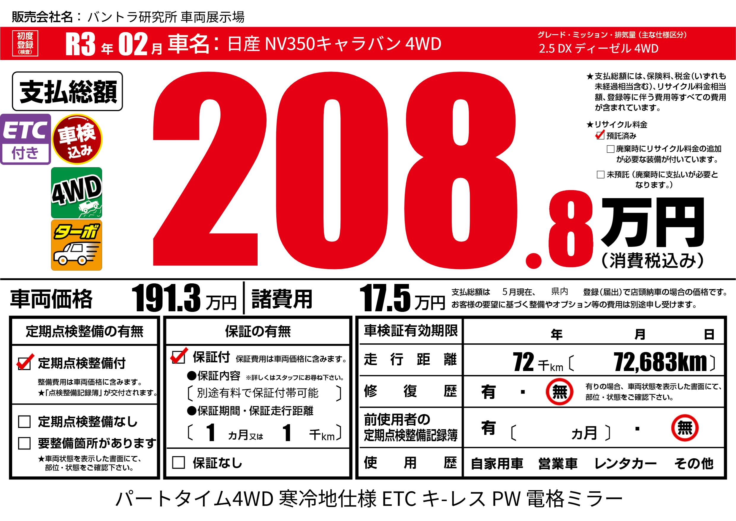 | 車名 | 日産 NV350キャラバン 4WD | グレード ミッション 排気量 |