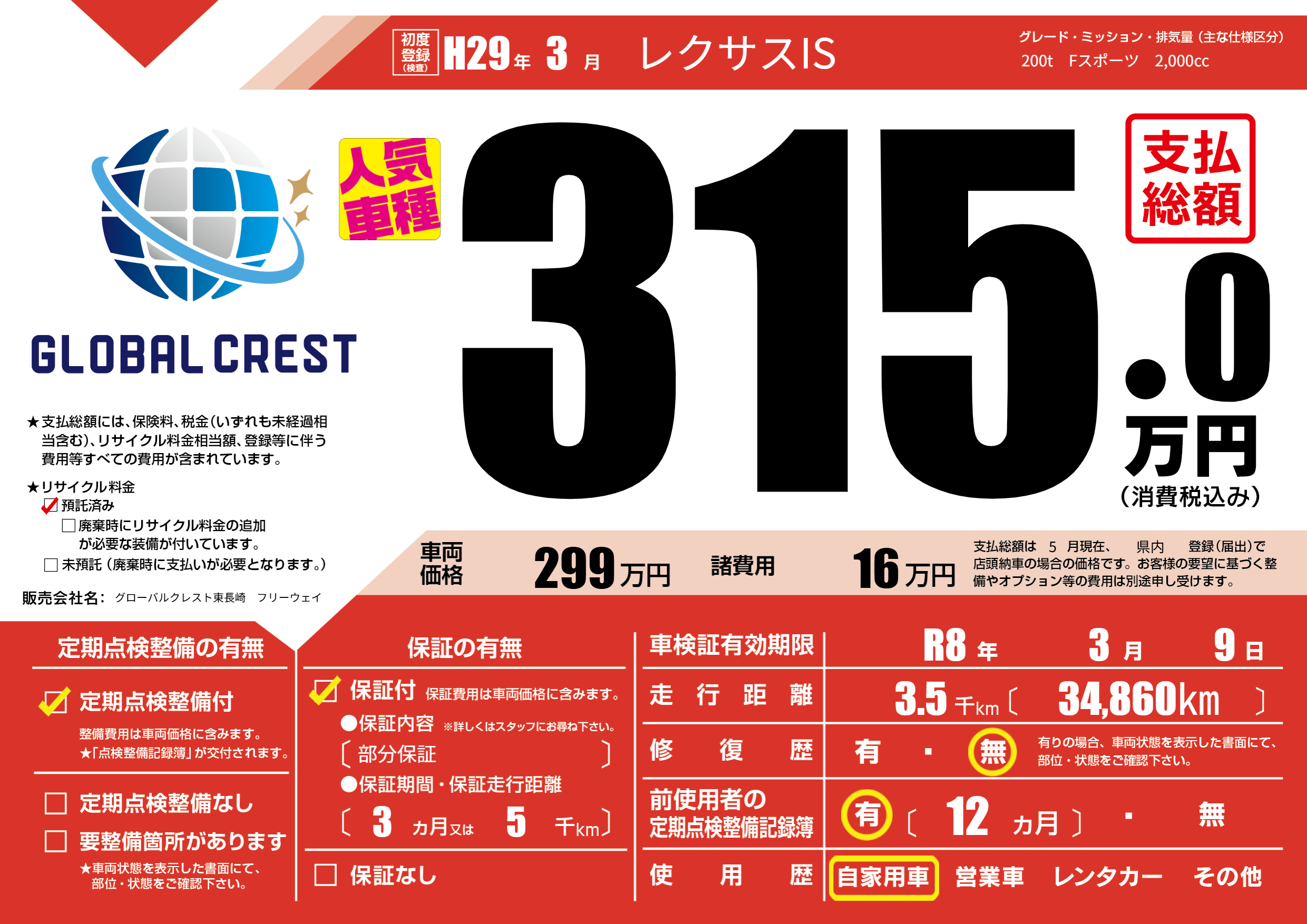 | 車名 | レクサスIS | グレード ミッション 排気量 |