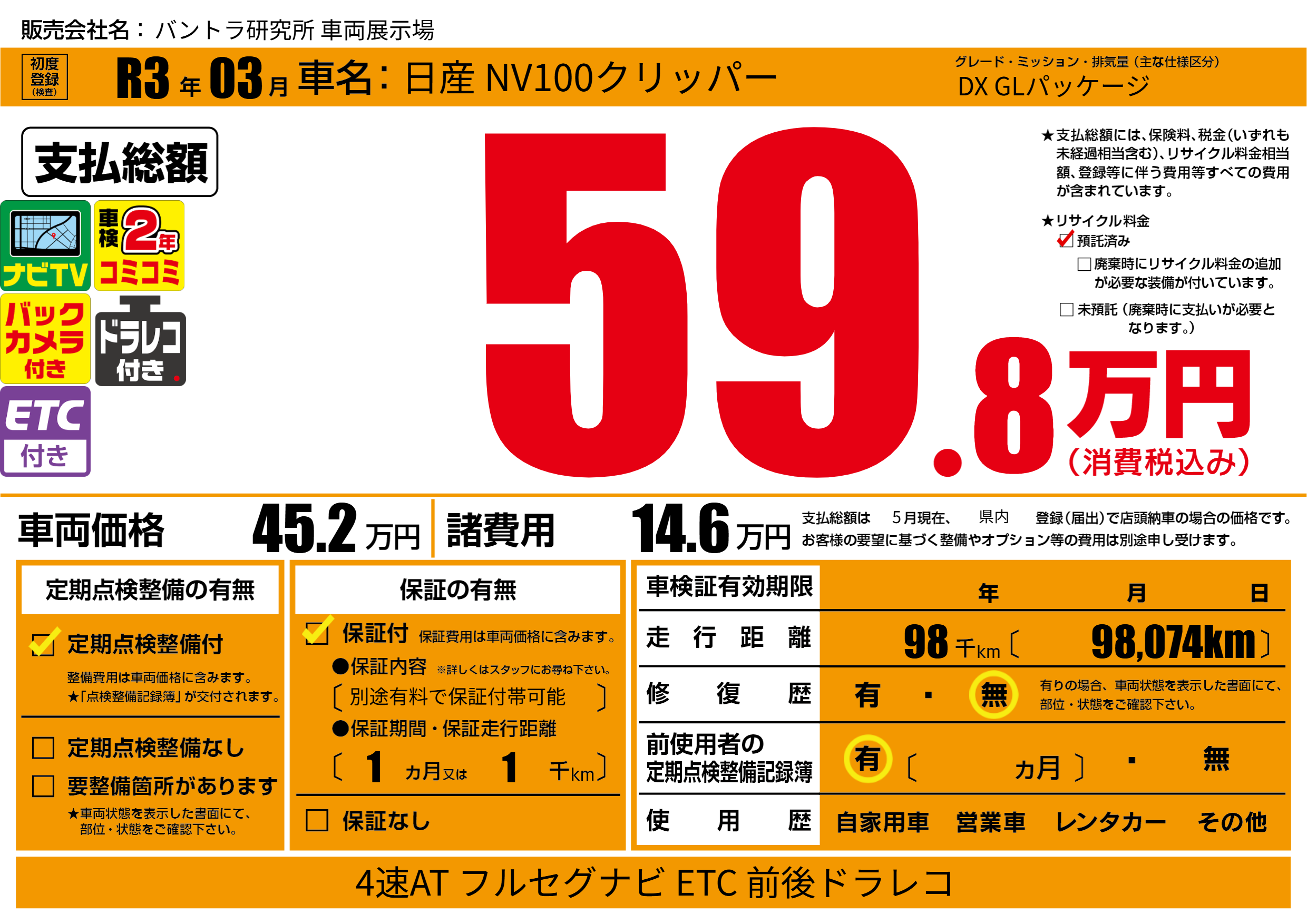 | 走行キロ | 9.8万km | 初年度登録 | R3年03月 |