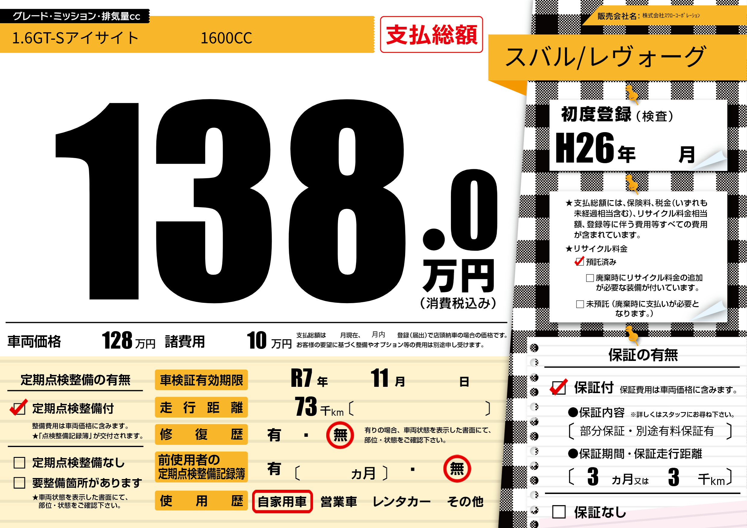 保証付き 保証内容(部分保証・別途有料保証有) 3ヶ月または(3)千kmまで |
