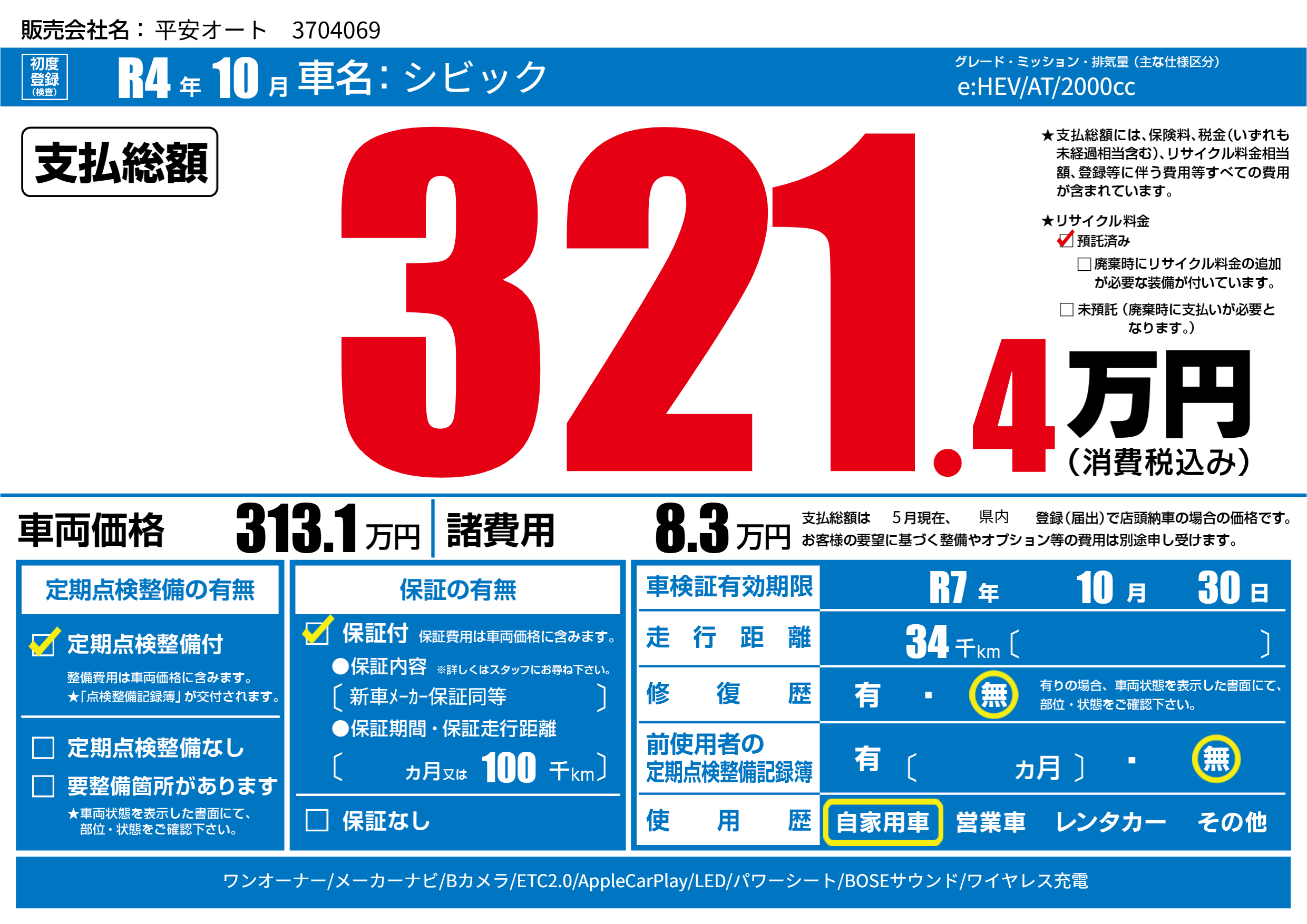 | 車検制限 | R7年 10月 30日 | ||