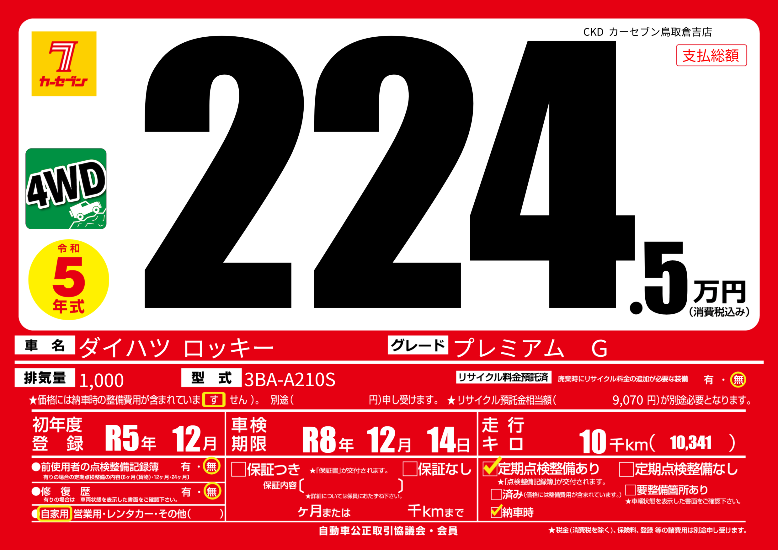 | 走行キロ | 1万km | 初年度登録 | R5年12月 |