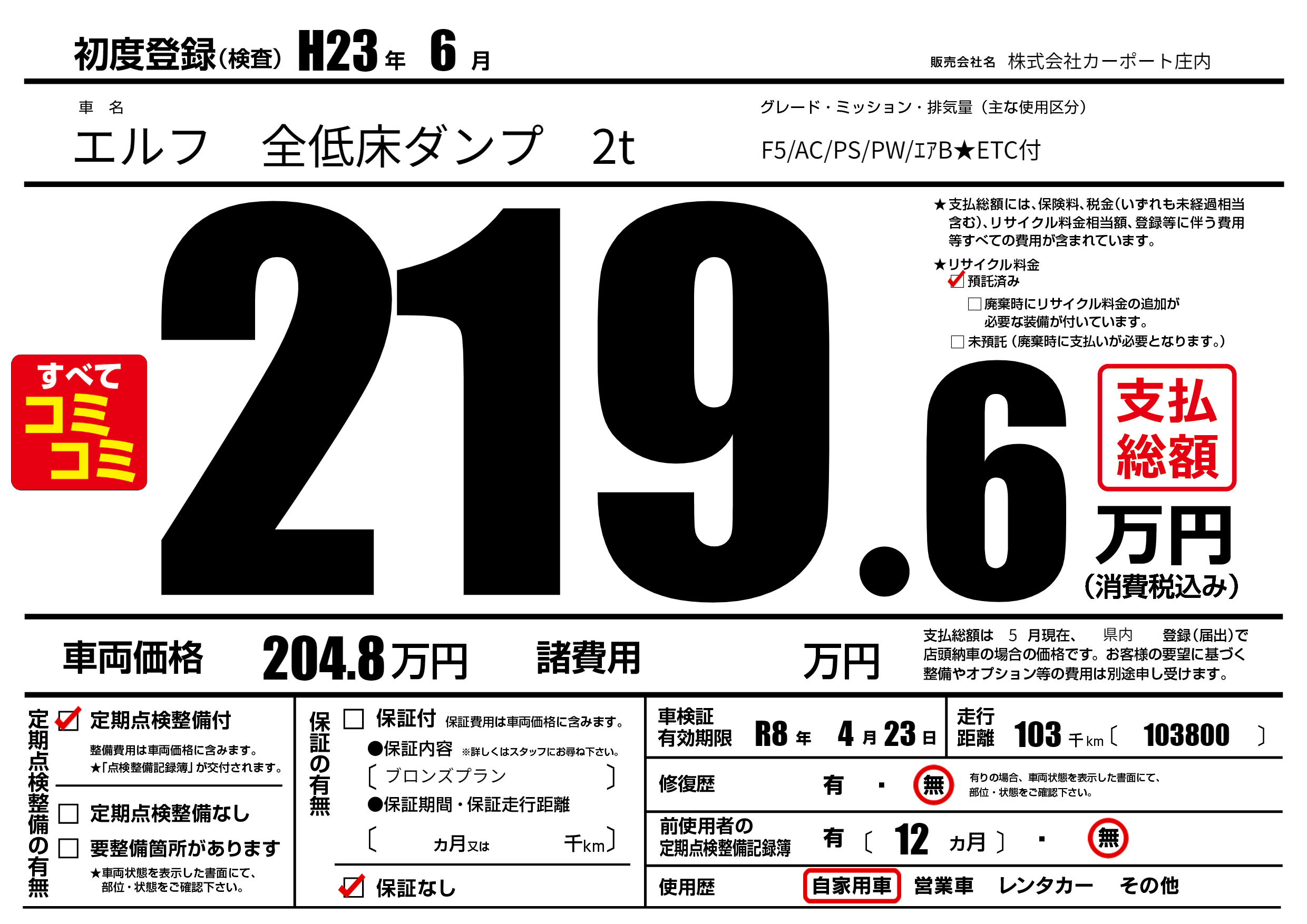 | 車名 | エルフ 全低床ダンプ 2t | グレード ミッション 排気量 |