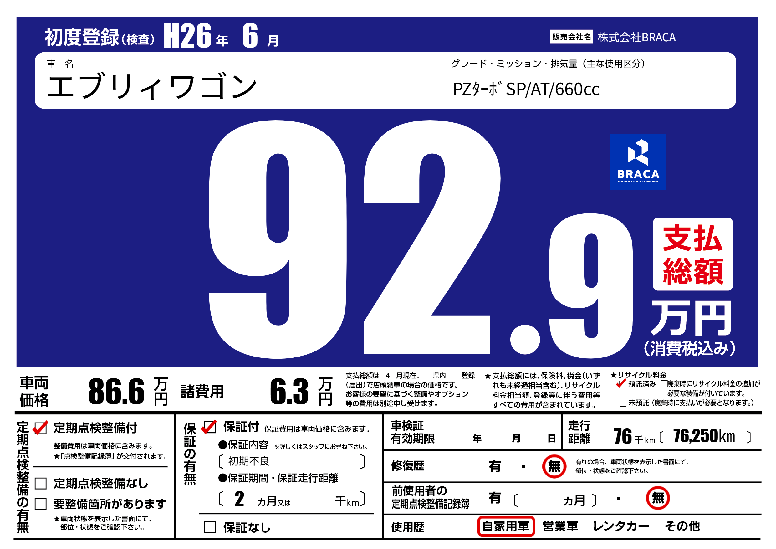 | 走行キロ | 7.6万km | 初年度登録 | H26年6月 |