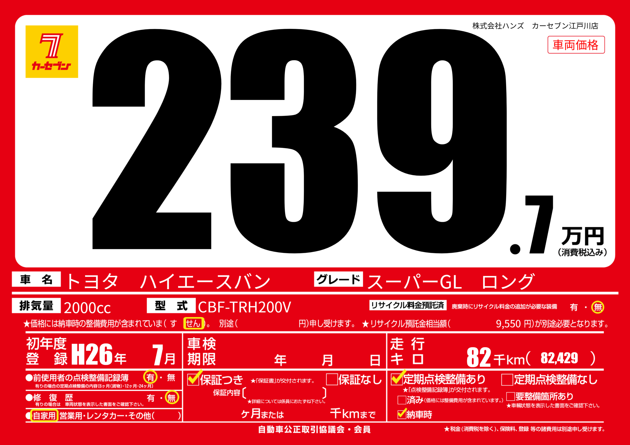 | 車名 | トヨタ ハイエースバン | グレード ミッション 排気量 |