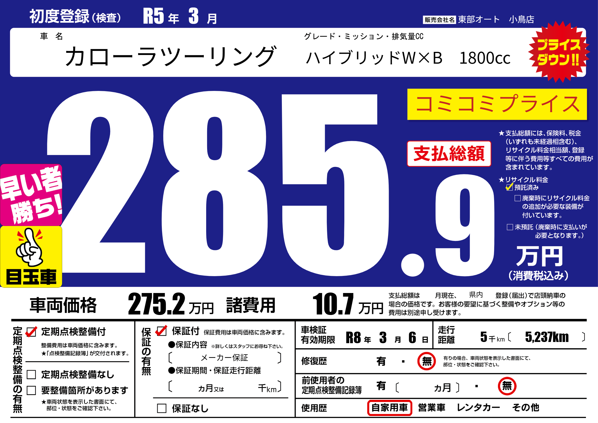 | 車名 | カローラツーリング | グレード ミッション 排気量 |