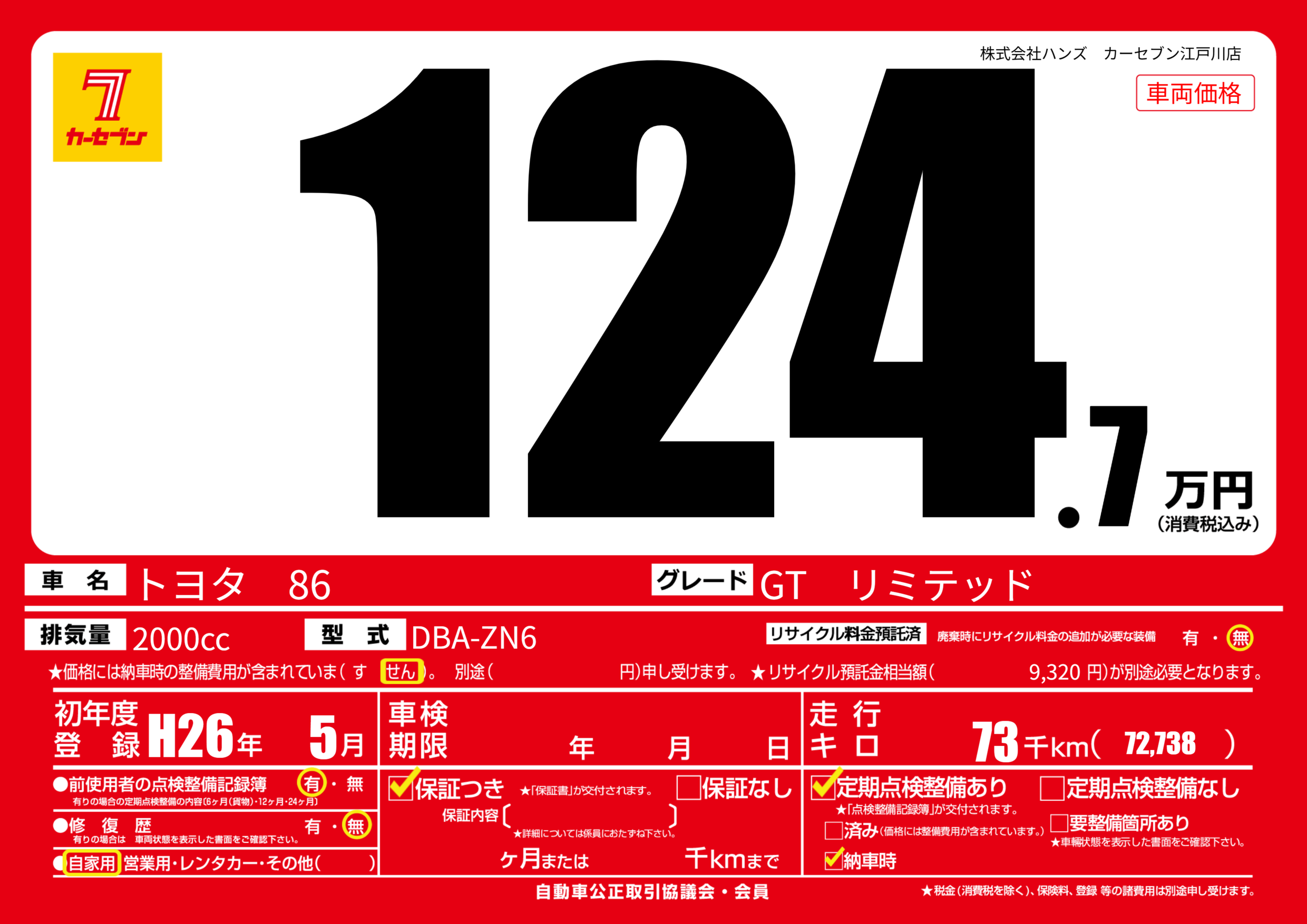 | 車名 | トヨタ 86 | グレード ミッション 排気量 |