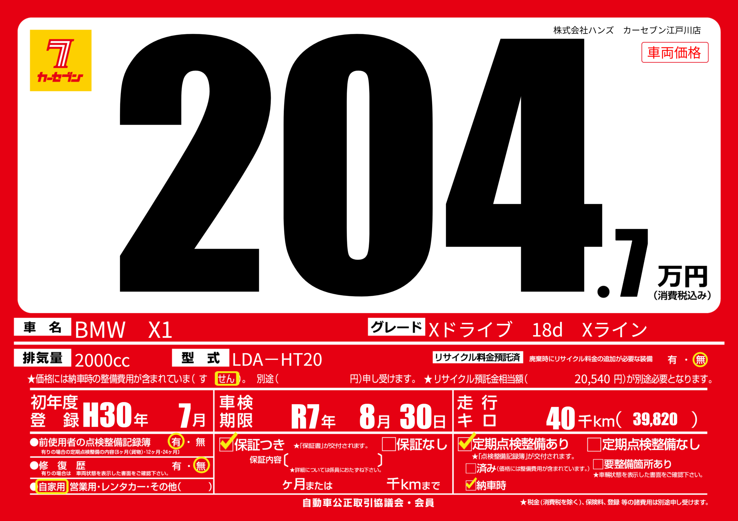 | 車名 | BMW X1 | グレード ミッション 排気量 |