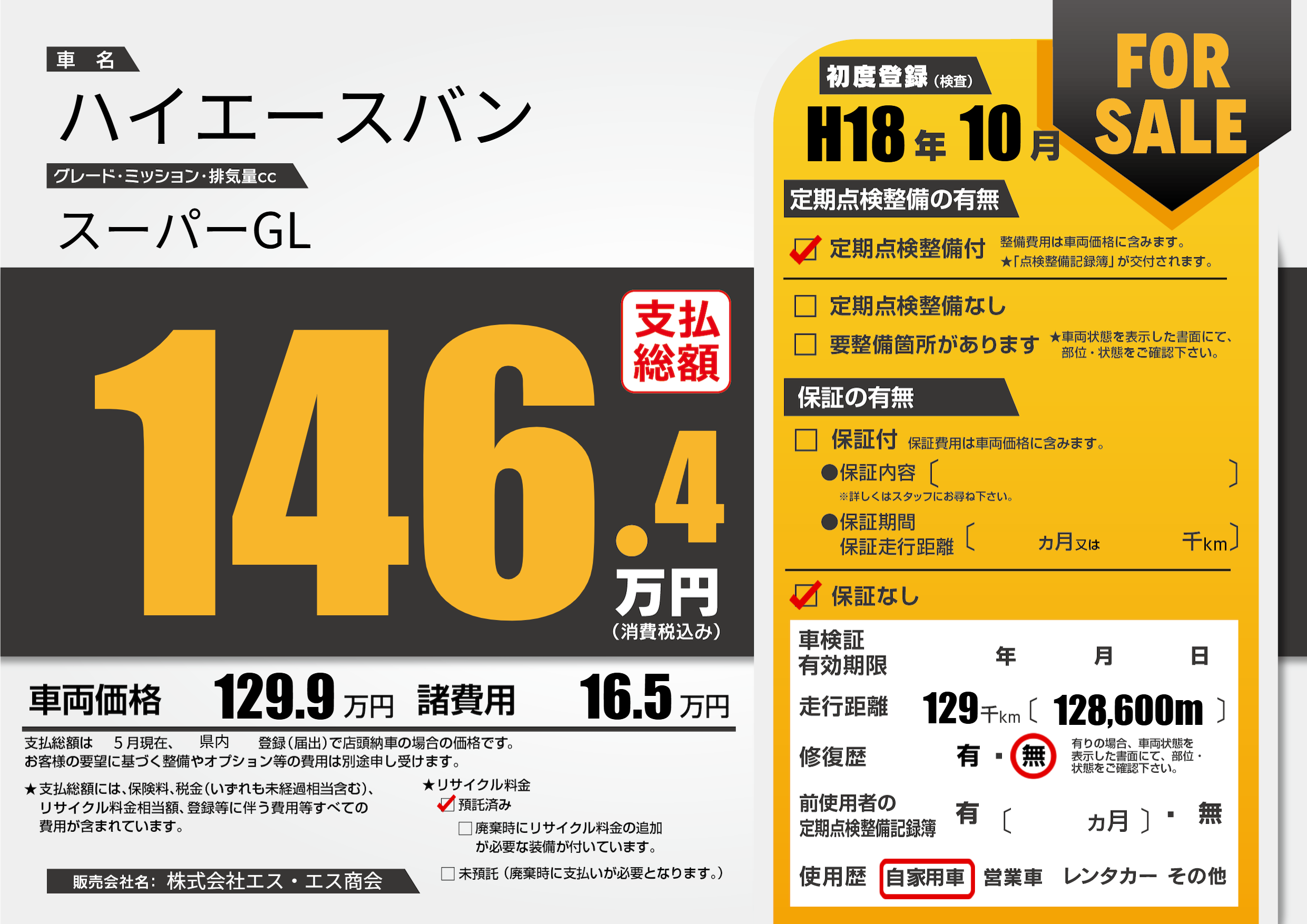 | 走行キロ | 12.9万km | 初年度登録 | H18年10月 |