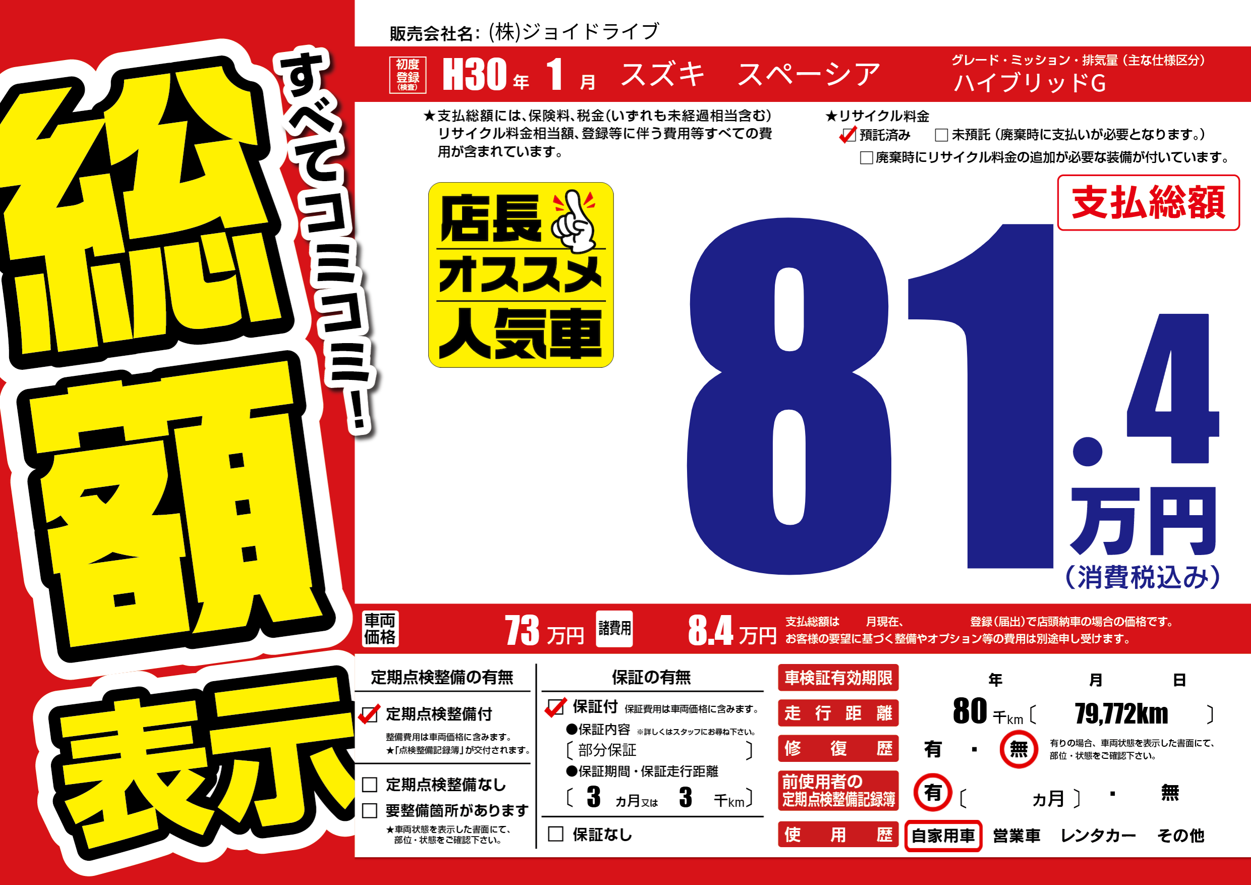 | 車名 | スズキ スペーシア | グレード ミッション 排気量 |