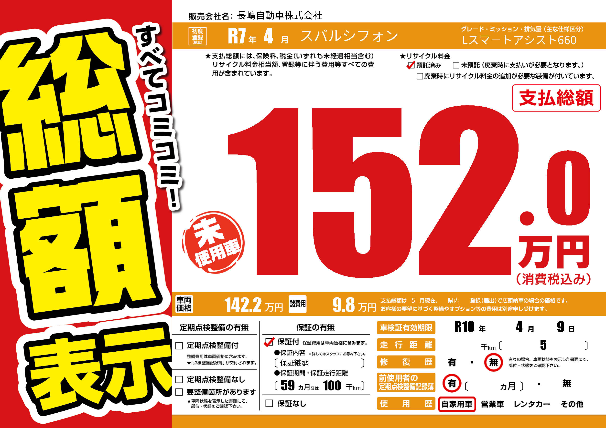 | 走行キロ | - | 初年度登録 | R7年4月 |
